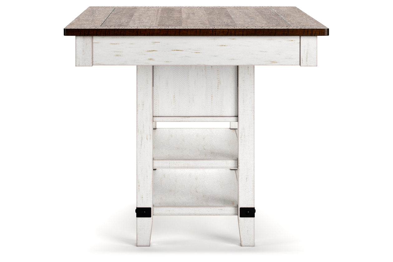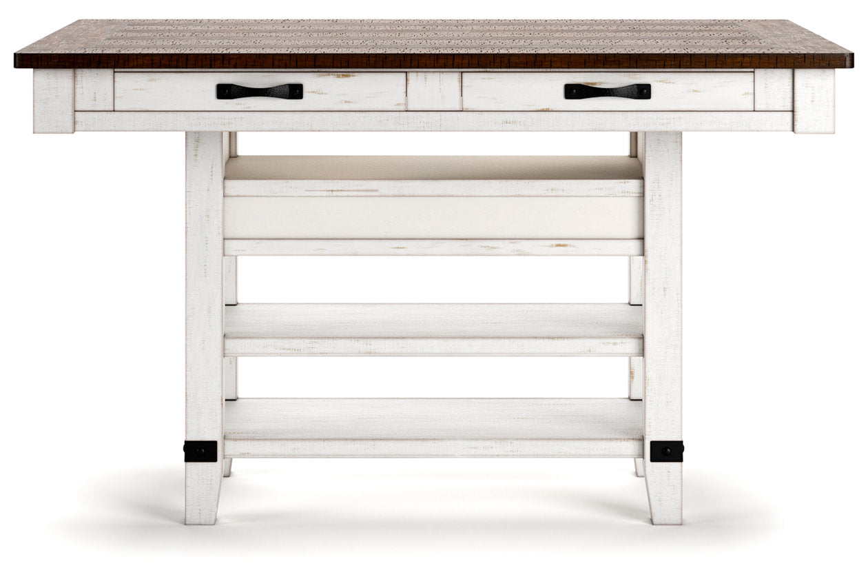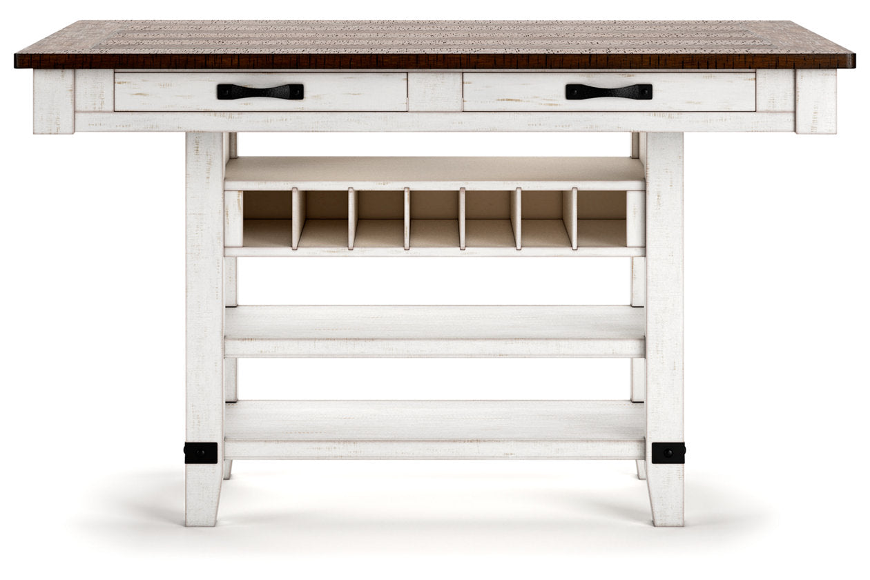 A high-style choice for dining spaces, this counter height dining table with 4 barstools serves up the best in rustic farmhouse living. Its two-tone finish pairs a brown tabletop with a distressed vintage white base for a double helping of charm. The table features four storage drawers (two on each side), a seven-bottle wine rack and two open shelves for display. The sturdy post and bracket base design, with black metal accents and a thick dining top, lends an earthy appeal. Luna Furniture introduces Valebeck Counter Height Dining Table and 4 Barstools to enhance the beauty of your living spaces.