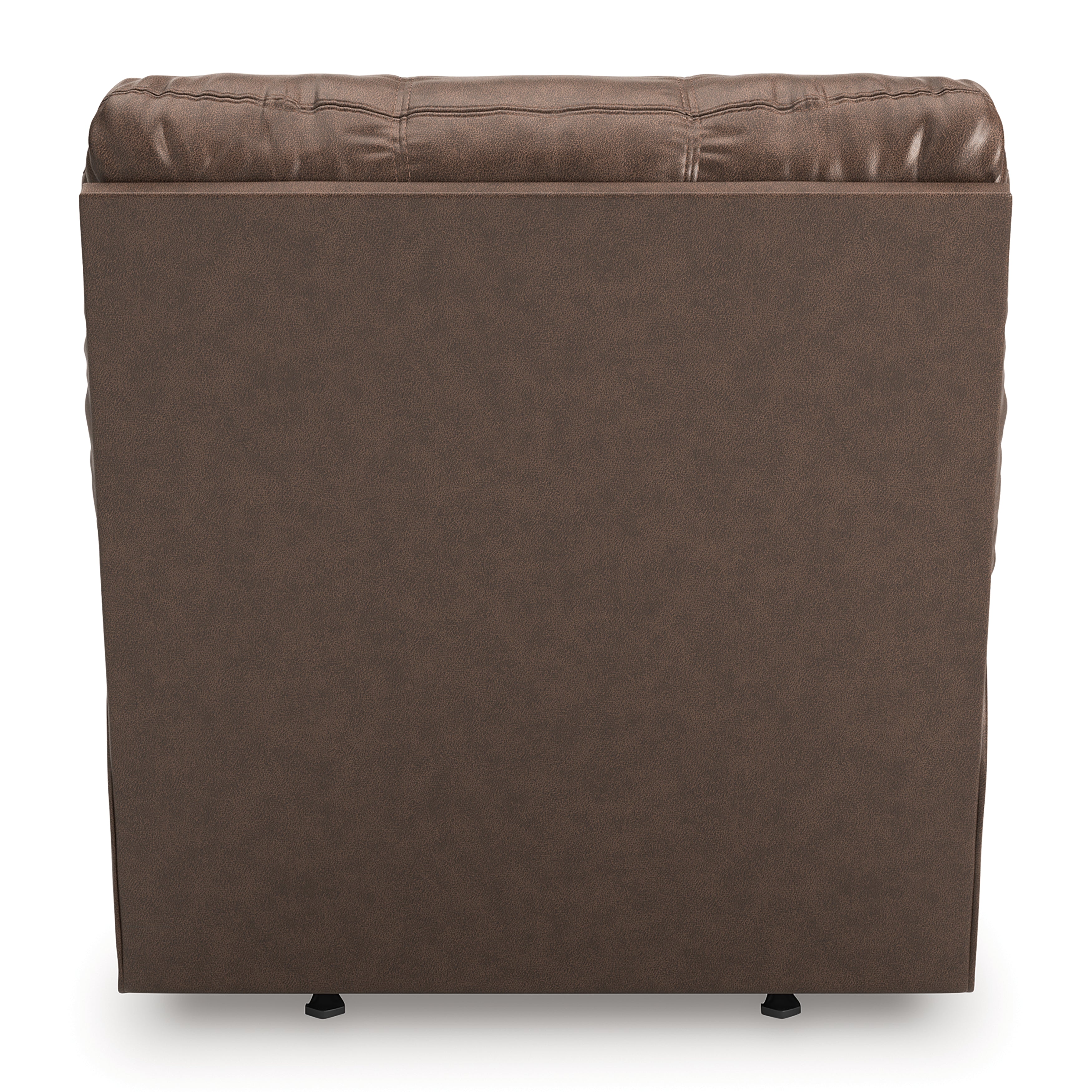 Modern comfort never looked so good. Sporting supremely soft yet durable cushions accented with high-fashion jumbo stitching, this stunning rocker recliner is the ultimate choice in comfortably cool, contemporary style. Its umber-hued faux leather indulges with an upscale feel and wows like the real thing. And the recliner's pull-tab reclining makes it easy to kick back and relax.