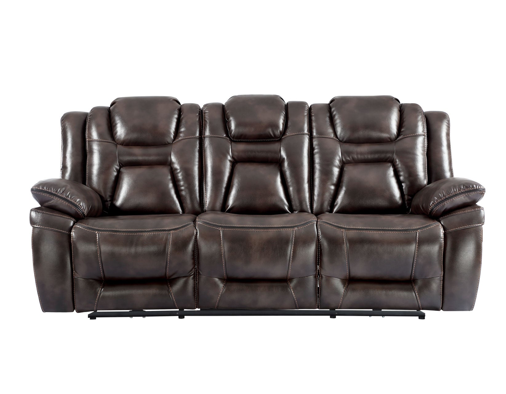 Start your engines with the Dual-Power Optimus motion group. Elaborate padding and stitching give your seat the look and feel of a race car right in your living room. Draped in beautiful coffee leatherette, this group also has all the bells and whistles you crave with a Dropdown console that serves as the hub of your living room.