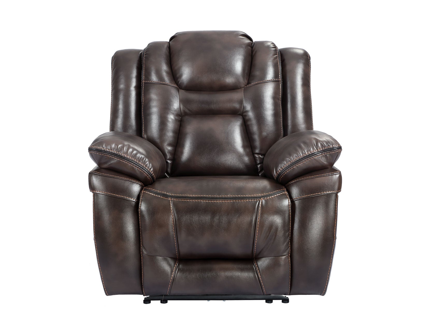 Start your engines with the Dual-Power Oportuna motion group. Elaborate padding and stitching give your seat the look and feel of a race car right in your living room. Draped in beautiful coffee leatherette, this group also has all the bells and whistles you crave with a Dropdown console that serves as the hub of your living room.