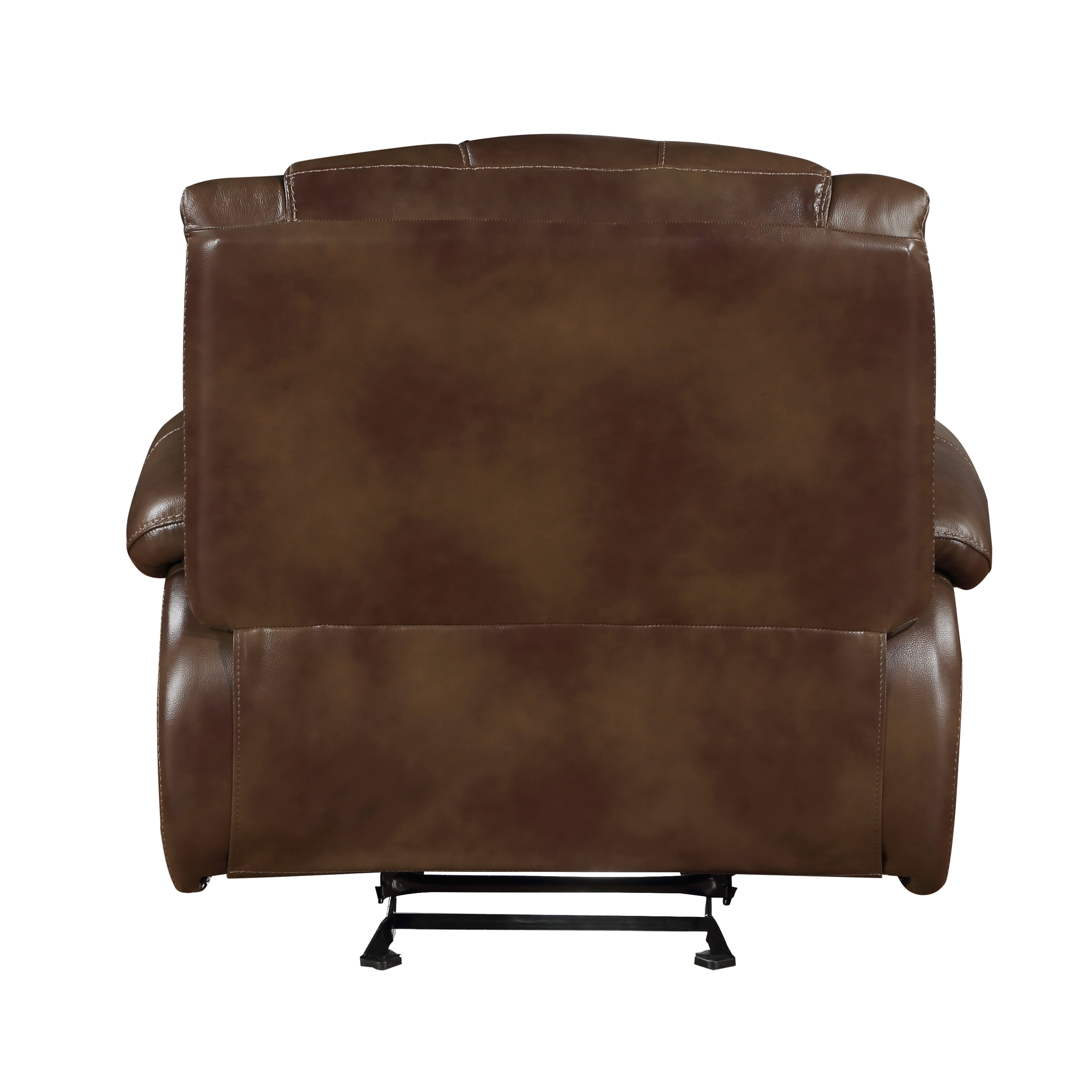 Comfort and style pair to create the casual look of the Ellicott Collection. The plush seating and transitional frame of the sofa, love seat, and chair features top grain buffalo leather where the body touches, with faux leather covering the remaining areas, its brown hue complementing your home’s décor. The dual manual motion recliners of the sofa and love seat are engaged with the pull of the side mounted tabs. The chair’s glider reclining mechanism allows for gentle rocking as well as a pull tab-engaged reclining action.