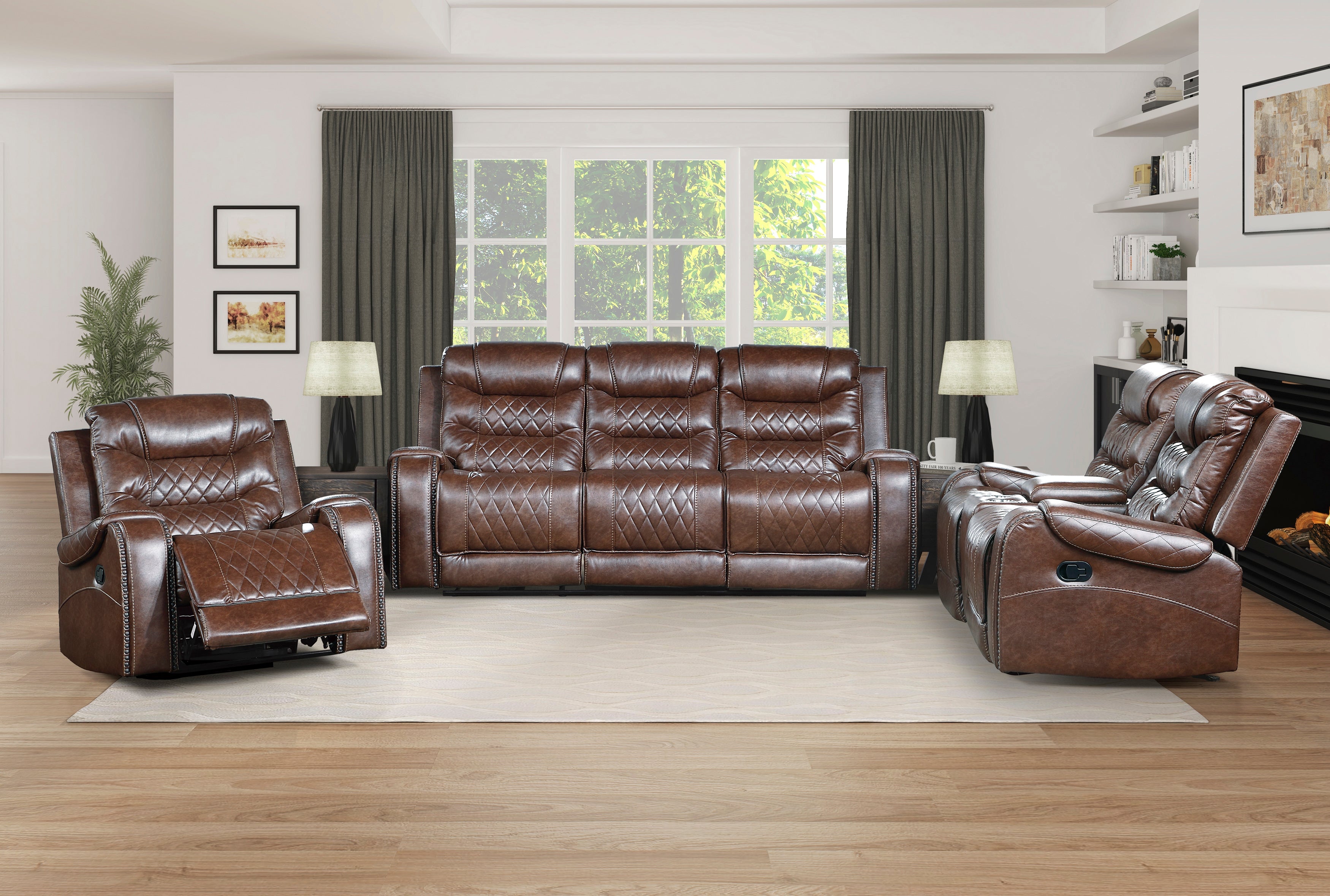 The Putnam Collection will serve as a functional, stylish, and comfortable seating group for your living room. The sofa features dual manual reclining mechanisms allowing for perfect placement and function within your available space. The sofa’s drop-down center seatback table features cupholders. The Putnam Collection is offered in brown polished microfiber fabric with diamond pattern stitching with nailhead-adorned arms for classic decorative effect.