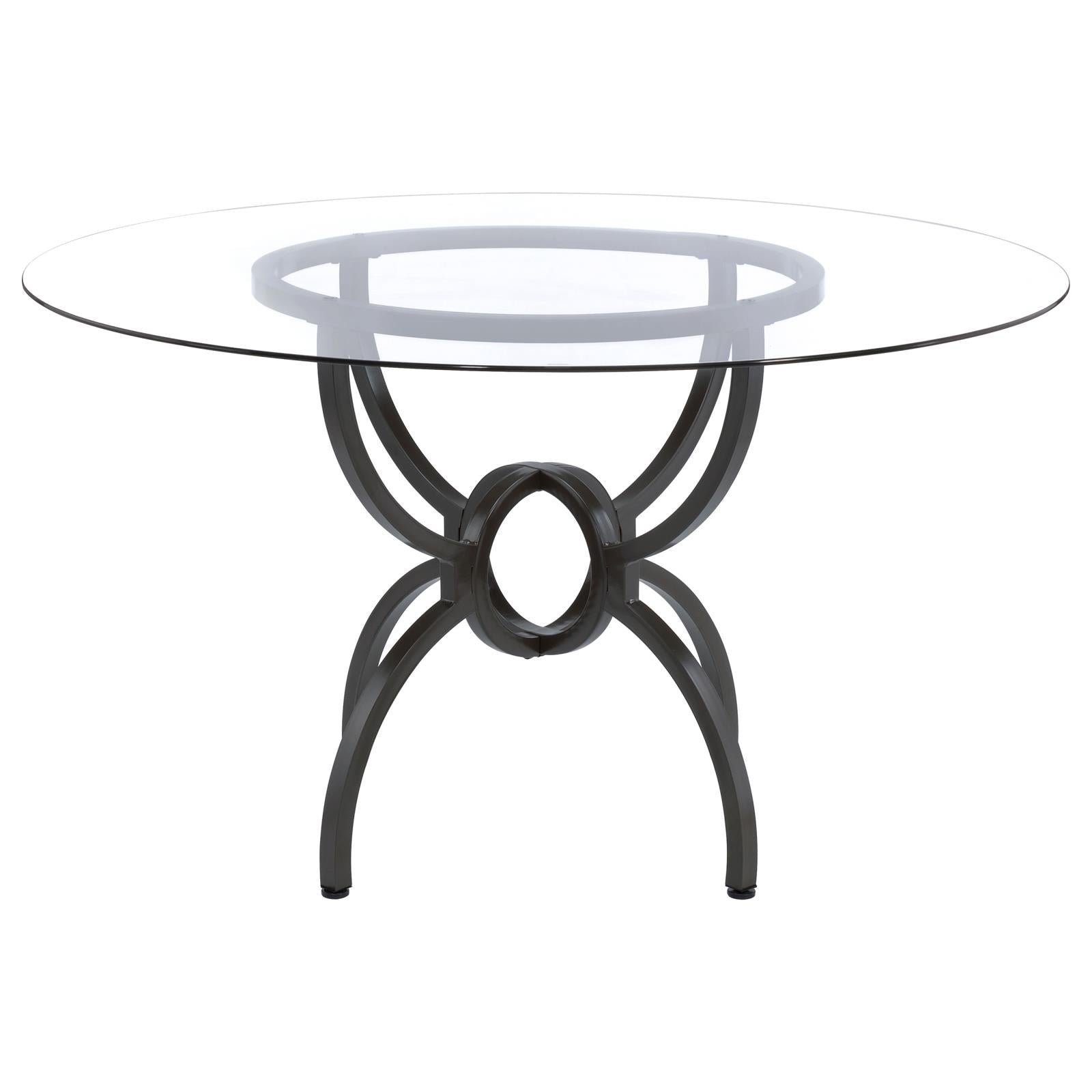 Aviano presents a contemporary dining masterpiece that's truly captivating. The meticulously crafted metal table base boasts four curvaceous legs converging around an interlocking ring waist, adorned with a surprising gunmetal finish. Crowned with a 6mm 48" diameter clear tempered glass, it seamlessly blends grace and modernity. Discover the allure of the transitional glass dining table, exuding casual charm. Its clear glass round elegantly rests on a captivating base with four stylized M legs, artistically interlocked in a ring motif and adorned with a rich gunmetal finish. At 30 inches, it's the perfect addition for a chic breakfast nook or a stylish eat-in kitchen, infusing a touch of timeless elegance.