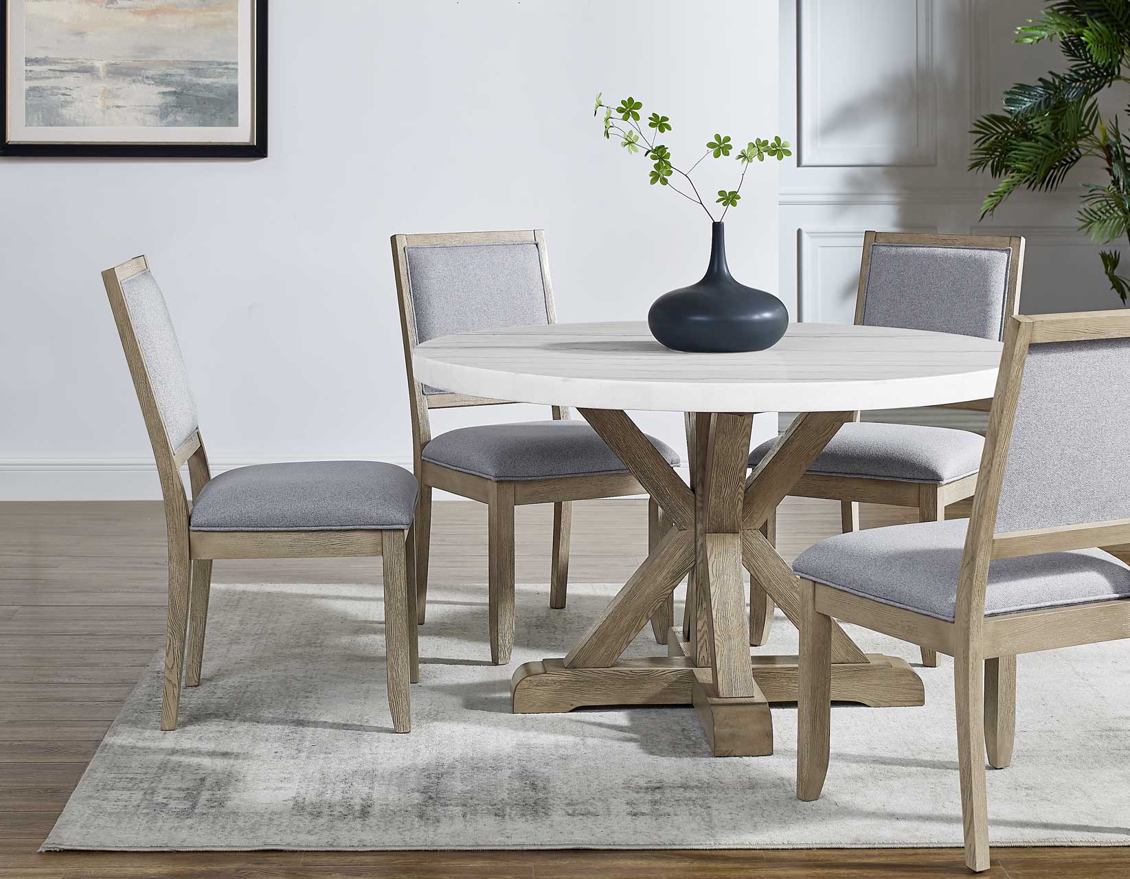 The 5-Piece Carena Dining Set is sure to elevate your dining experience. Centered by the stunning Carena Dining Table and flanked with the Carena Side Chairs, this set features a captivating 52-inch round white marble top resting on a rustic trestle base for the perfect complement of strength and style. A single timber-beam design ensures robust support for the elegant marble surface, accommodating comfortable seating for six in style . The sophisticated marble top beautifully contrasts with the casual wheat finish over the solid poplar wood trestle base, adding rustic beauty to your dining space. The accompanying Carena Side Chairs boast solid tapered wood legs and a chic modern silhouette, upholstered in gray polyester fabric for both style and comfort.