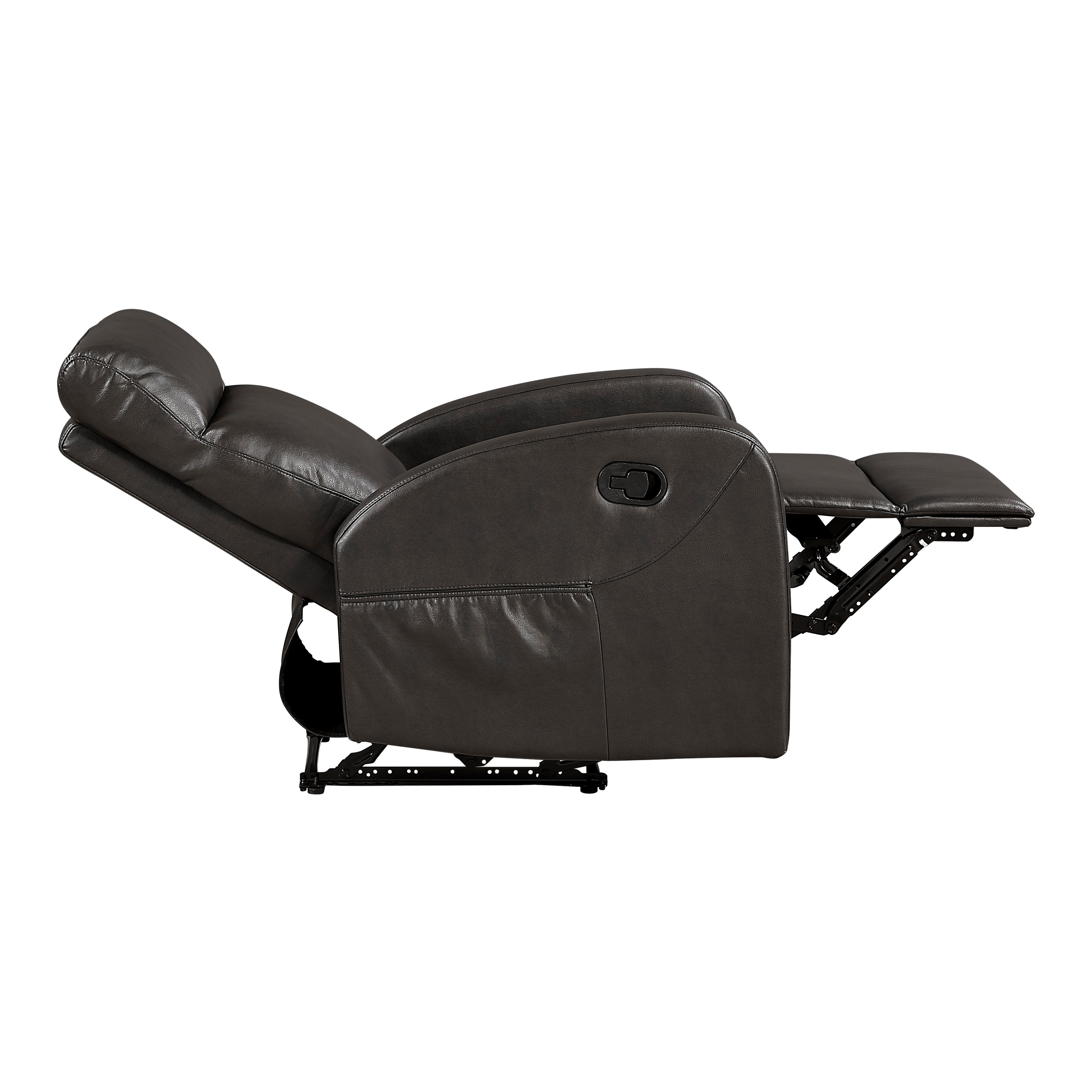 Maximize your comfort and your space with this sleek and functional wall-hugger reclining chair. Constructed with a durable plywood frame and a metal-reinforced seat, this chair provides a sturdy and long-lasting foundation with a weight capacity of 300lbs. The plush foam padding over pocket coils and soft faux leather upholstery offer a comfortable and inviting seating experience. Designed with a convenient tab pull reclining motion and a wall-hugger feature, this recliner requires only 2 inches of clearance from a wall to fully recline, making it perfect for small living spaces. An integrated side pocket provides a handy spot for magazines or remote controls, combining modern convenience with classic comfort in a streamlined design.