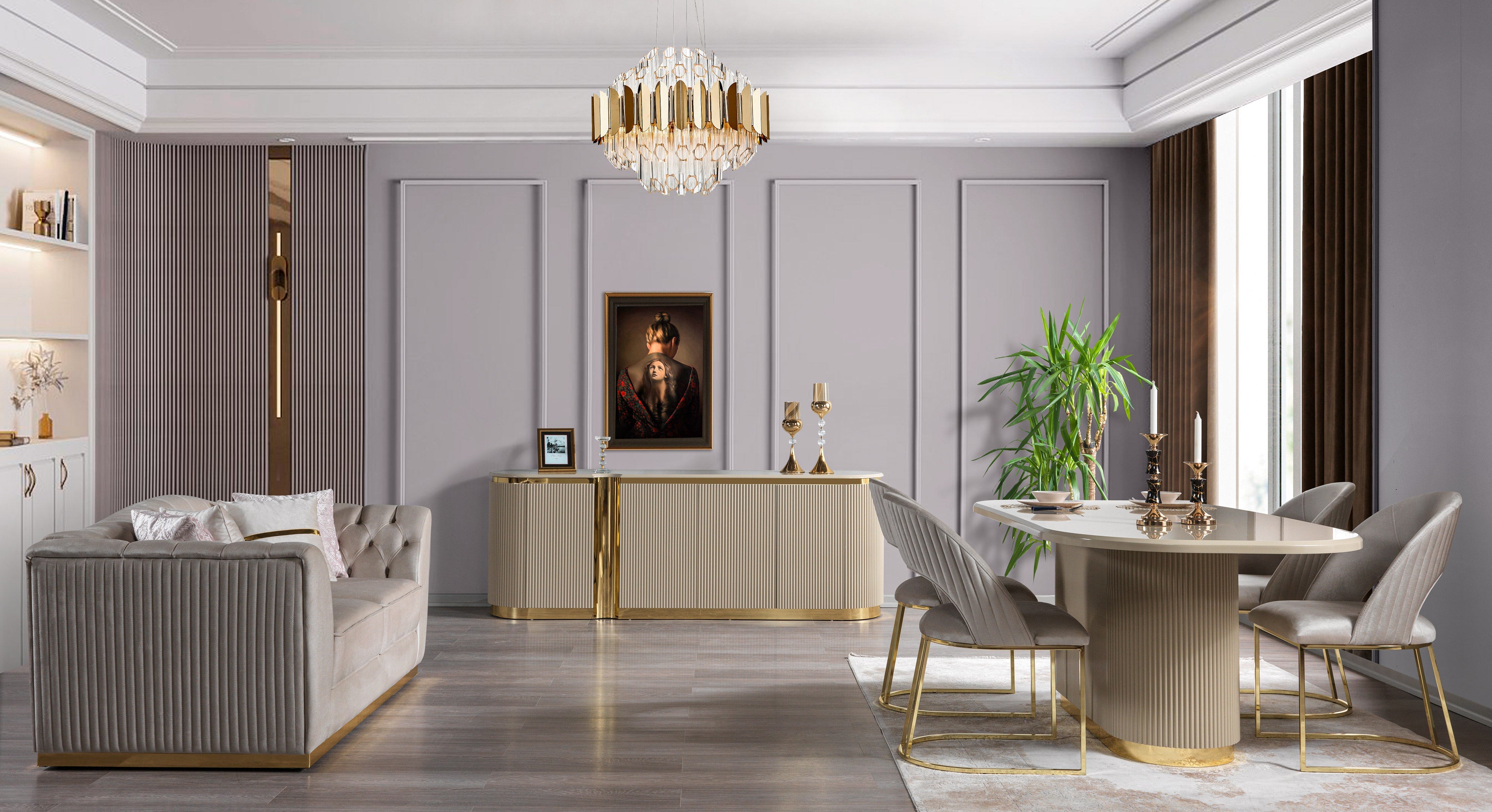 Transform your dining experience with the sophisticated Milena Ivory 9-Piece Dining Set by Nova Furniture, a statement of refined taste and everyday practicality. This meticulously designed dining ensemble sets the tone for unforgettable gatherings and quiet family dinners in any modern urban home or elegant suburban retreat. Envision laughter-filled evenings, celebratory brunches, and holiday feasts surrounded by the gentle opulence of high-gloss ivory and shimmering gold accents. The generous table and eight ergonomically contoured chairs promise both grandeur and comfort, instantly elevating your interior with their contemporary yet classic flair. Harmonizing with everything from minimalist urban lofts to chic transitional spaces, the Milena is as much a celebration of design as it is of togetherness. Luna Furniture introduces Milena Ivory 9-Piece Dining Set to enhance the beauty of your living spaces.