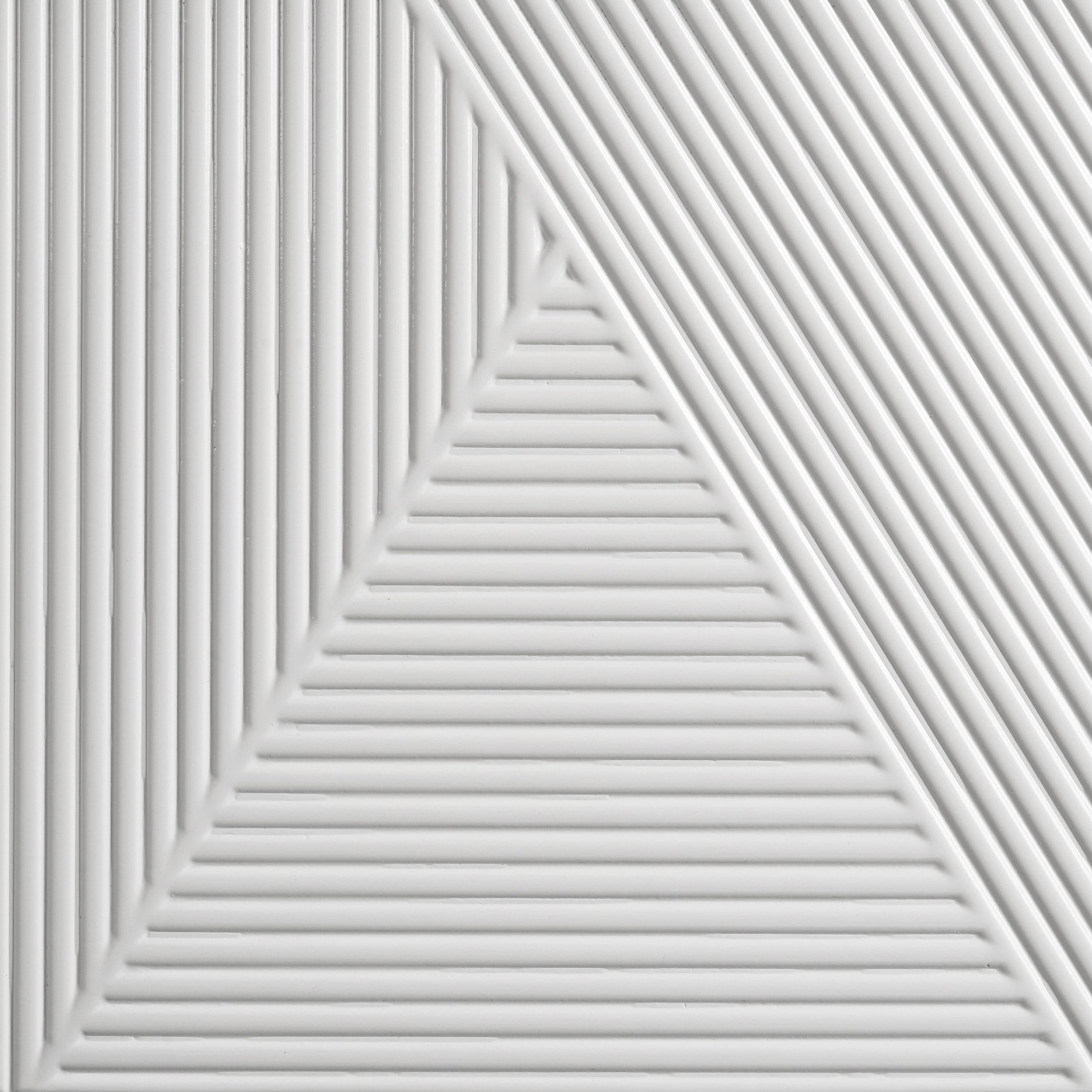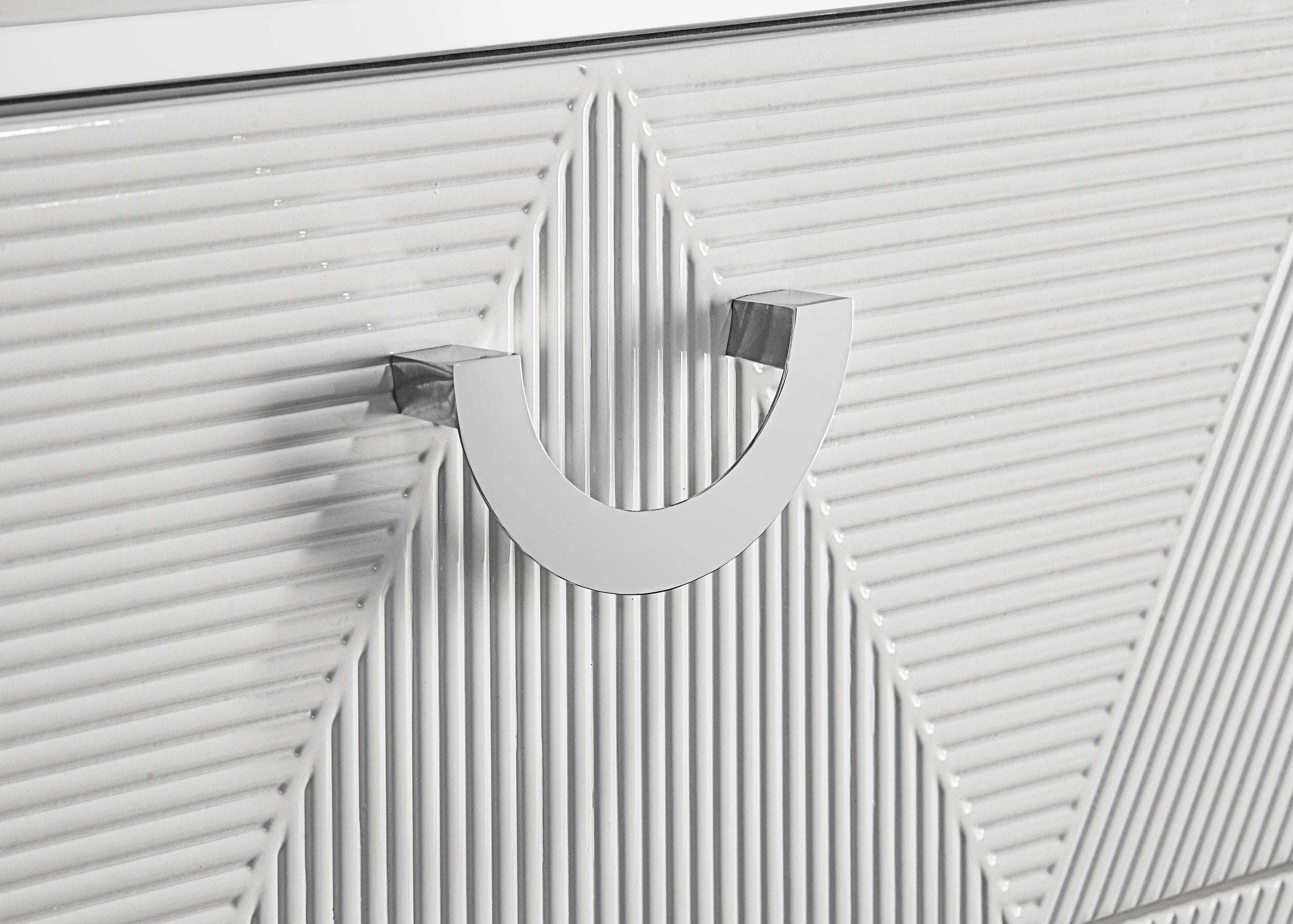 Crisp white high gloss and sculptural textures define this modern bedroom set, blending sleek surfaces with dimensional details. Geometric drawer fronts feature ribbed V-patterns and polished chrome pulls, while all drawers glide smoothly on 45mm ball bearing hardware. The headboard stands out with chevron-tufted white faux leather framed by soft white LED trim. Completing the ensemble, a coordinating LED dresser mirror adds ambient glow and polished symmetry to the space. Elevated on chrome legs, this set is a showcase of contemporary form and function.