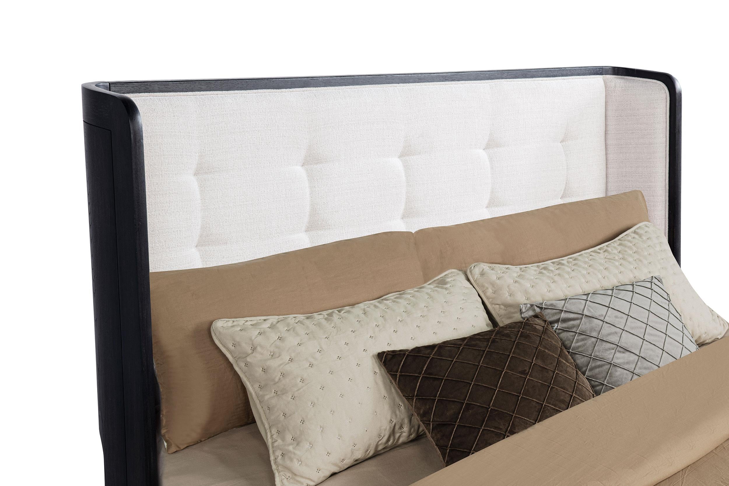 The Leandro bedroom set exudes quiet strength through softened forms and thoughtful materials. Anchored by a wingback bed with a cream upholstered headboard, the collection pairs sculptural silhouettes with a burnished black finish for moody depth. Each case piece features black felt-lined top drawers, English dovetail joinery, and soft-closing glides for enduring elegance. Dust panel construction and recessed pulls complete this study in modern simplicity and enduring comfort.