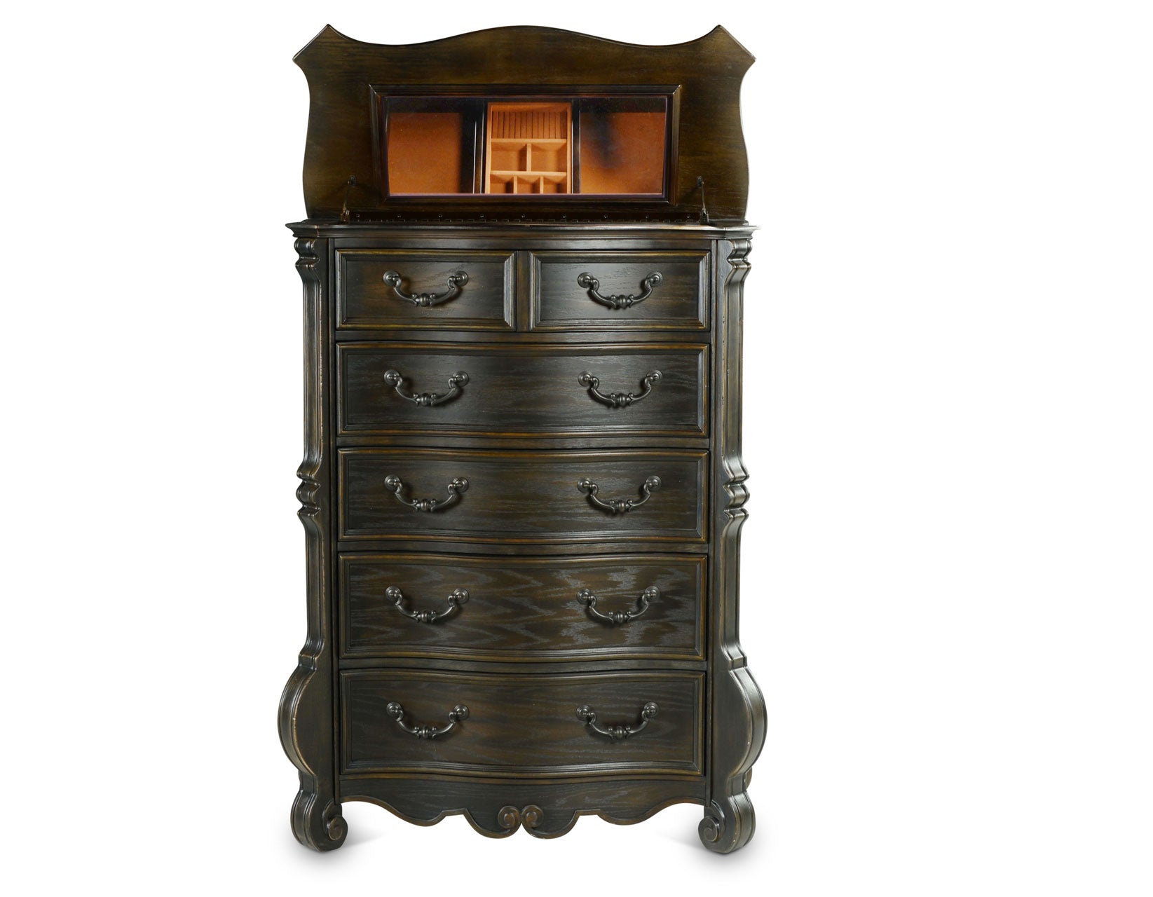 • Styling details include shaped Dresser fronts and drawers that duplicate the look and feel of antique furniture; fluted pilasters with scrolled feet, intricately shaped mirror with carving effect details and scrollwork on sides and top, button tufted headboard and footboard with scalloped, scrolled headboard, fluted pilasters and scrolled feet.