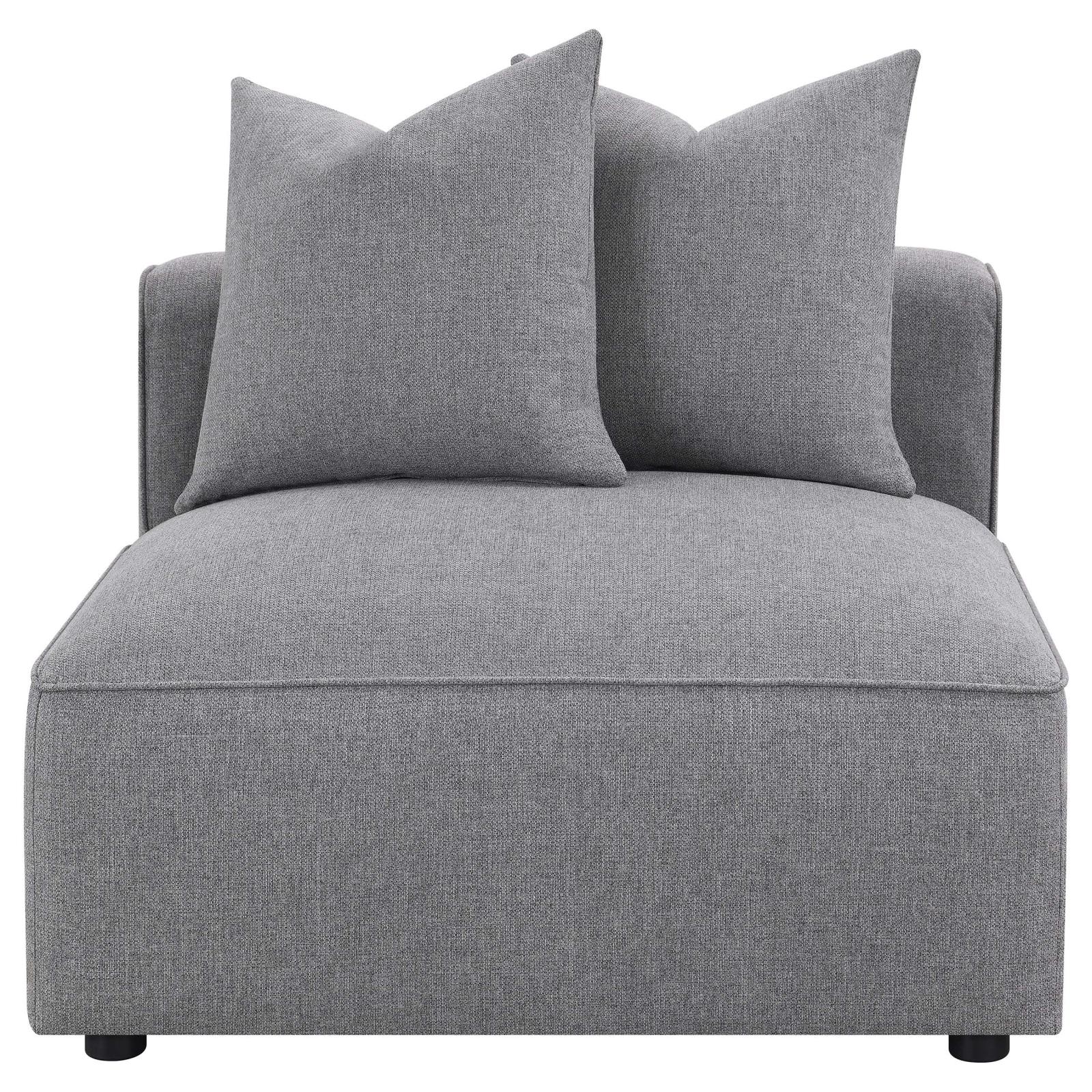 Gather around this large sectional sofa, featuring six modular pieces that invite you to rearrange it as needed for company and parties. Thick wide bases with waterfall edge-like profiles are accented with welt trim for a sleek tailored aesthetic. Perfect for accompanying your existing decor, the softly textured grey woven fabric offers a neutral and monochromatic color palette, welcoming fellow neutrals or adding a backdrop to vibrant colors. Matching pillows make up the back cushions, leaning back into track style armrests and backs. An ottoman easily transitions from a chaise lounge to a coffee table instantly.