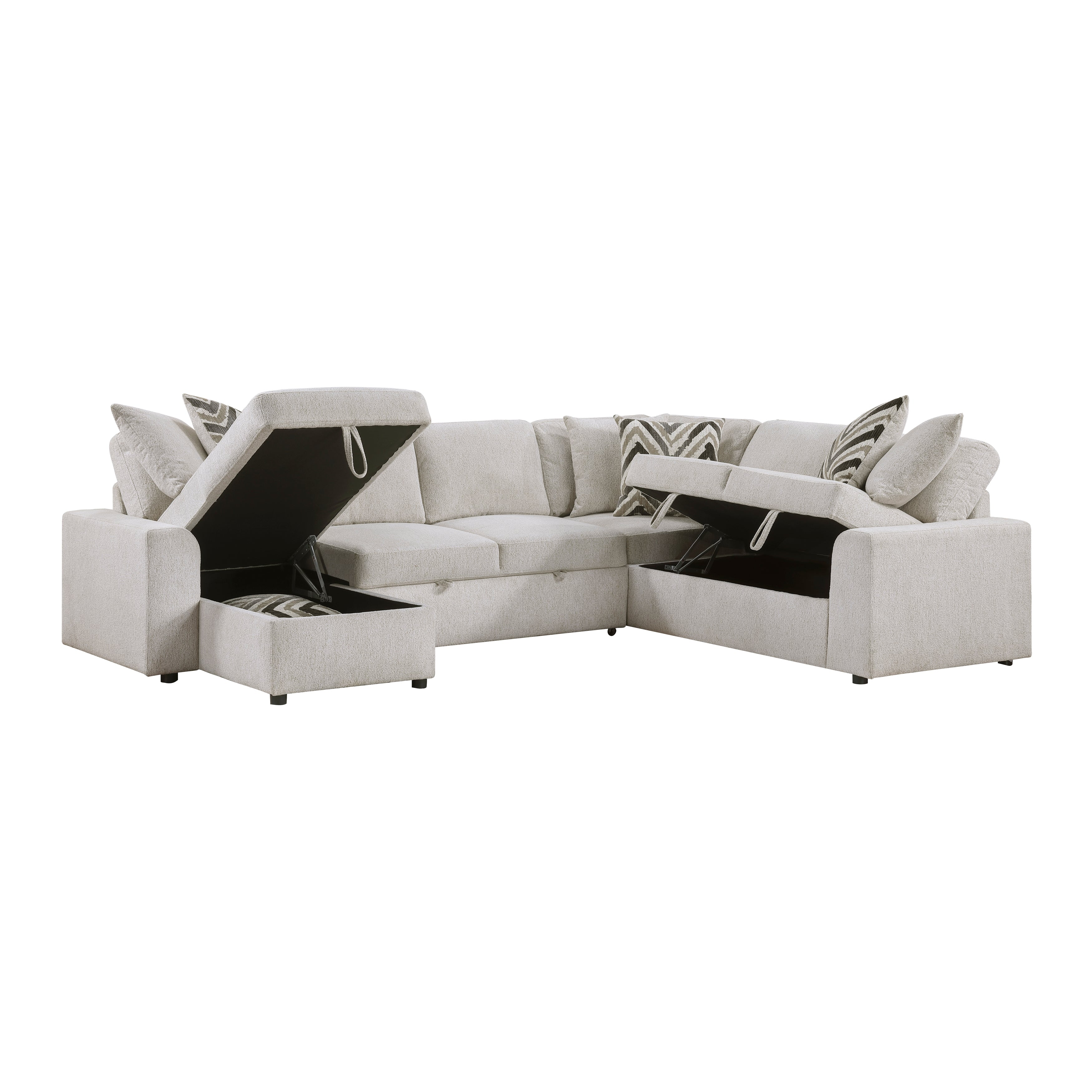 Maximize both comfort and functionality in your living space with this 3-Piece Sectional Sofa. This versatile sectional features a convenient pull-out bed, perfect for accommodating overnight guests, and hidden storage compartments in the chaise and ottoman, providing ample space for blankets, pillows, or other essentials. The soft, light beige fabric upholstery complements a variety of décor styles, while the six included decorative pillows add a touch of pattern and comfort. The reversible back cushions and multi-function design make this sectional ideal for apartments, condos, or family rooms. Enjoy the perfect blend of style, comfort, and practicality with this multi-functional sectional sofa.
