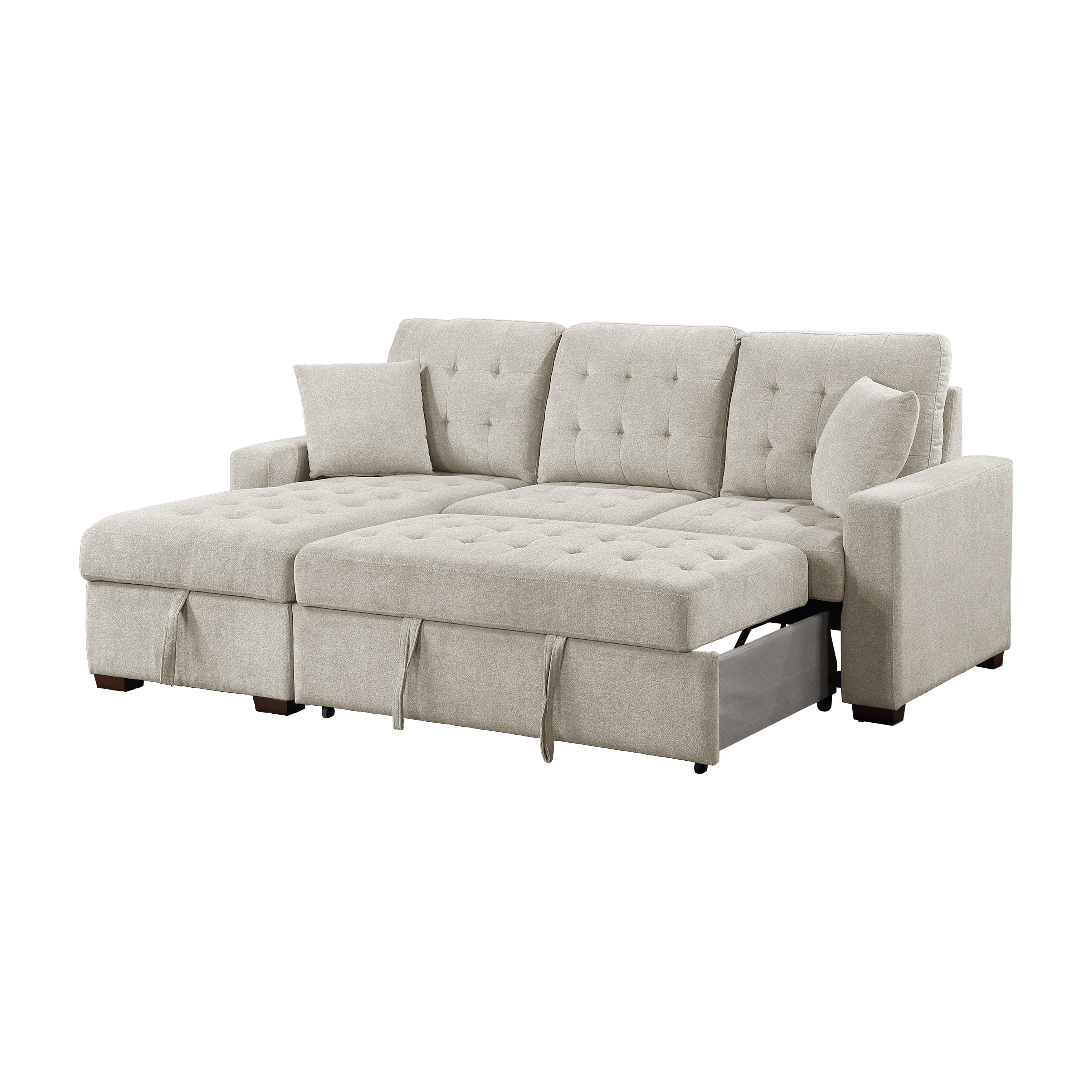 Expanding your seating area to include functional sleep space, the Waitsfield Collection is a versatile addition to your home. Sand-hued textured fabric upholstery covers the sectional with stitch tufting lending a decorative touch. The right-side 2-seater features a pull-out bed while the left-side chaise has a lift-top hidden storage unit beneath the seating area.
