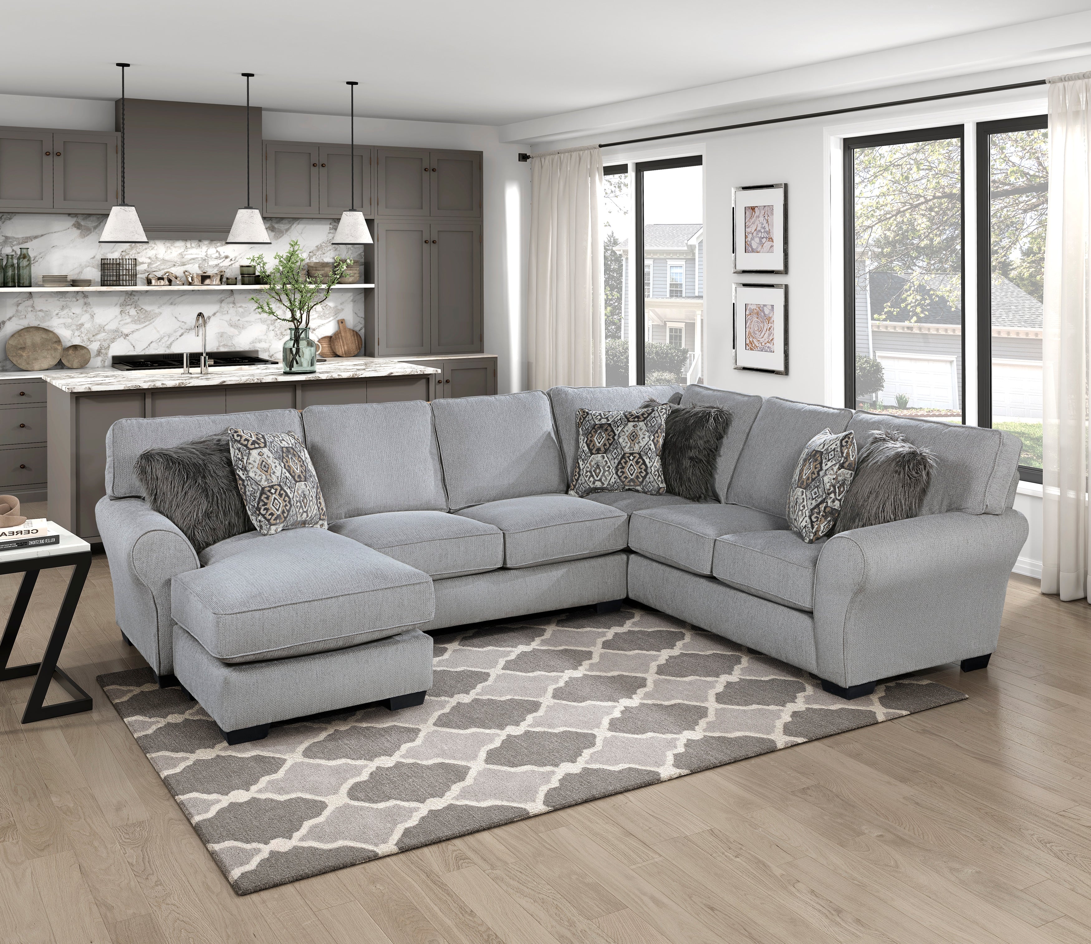 The transitional profile of the Kieran Collection is paired with a hint of modern flair to create a unique addition to your home’s living room. Gray chenille upholstery covers the sectional with both neutral patterned fabric, and graphite-hued faux fur accent toss pillows, adding a touch of whimsy. The corner sofa segment pairs with a three-seat sofa chaise to create the ample seating arrangement of the Kieran Collection.