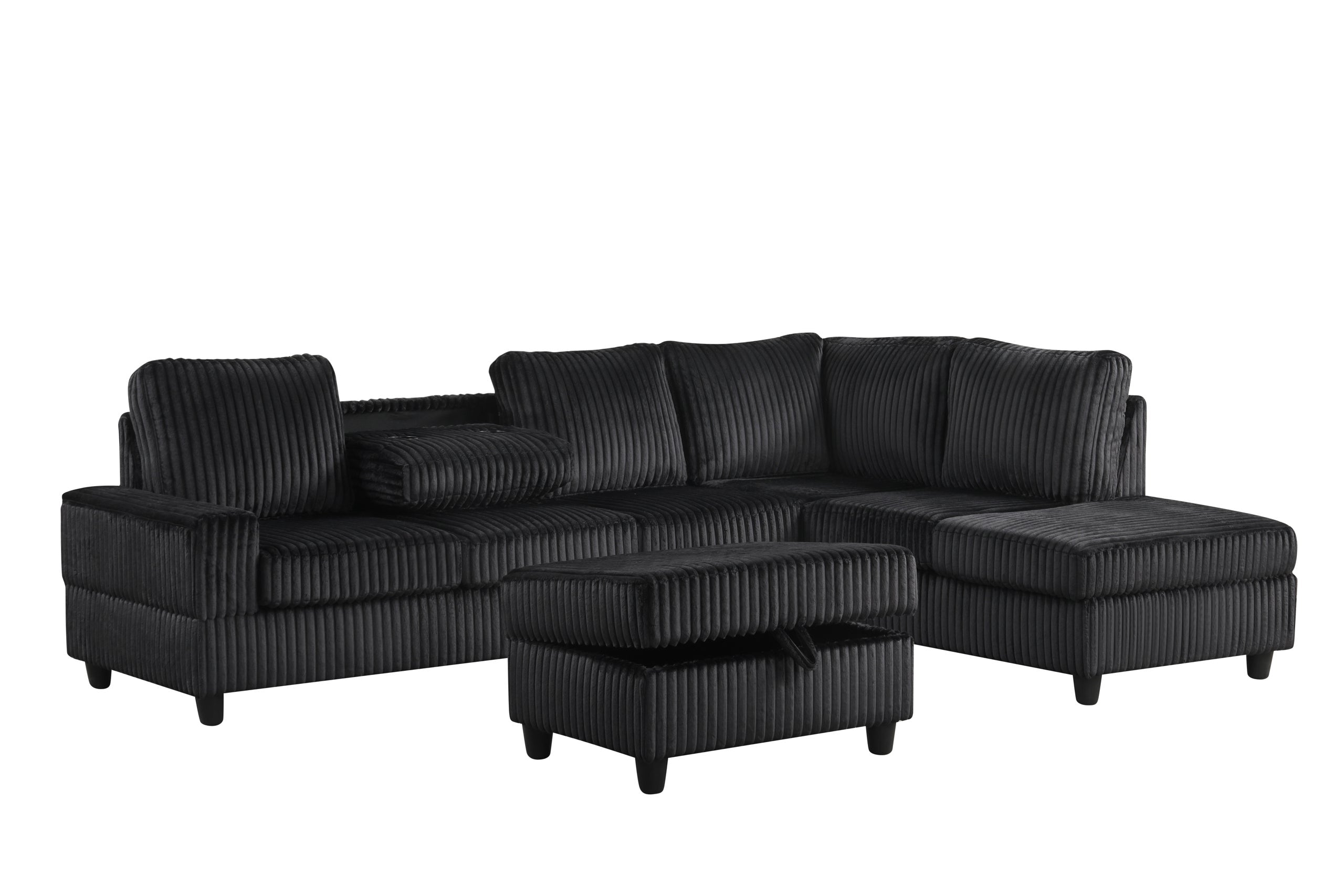 Sleek, simple, and modern. This sectional covered in a black cord fabric and features a drop down cup holders table and a storage ottoman.