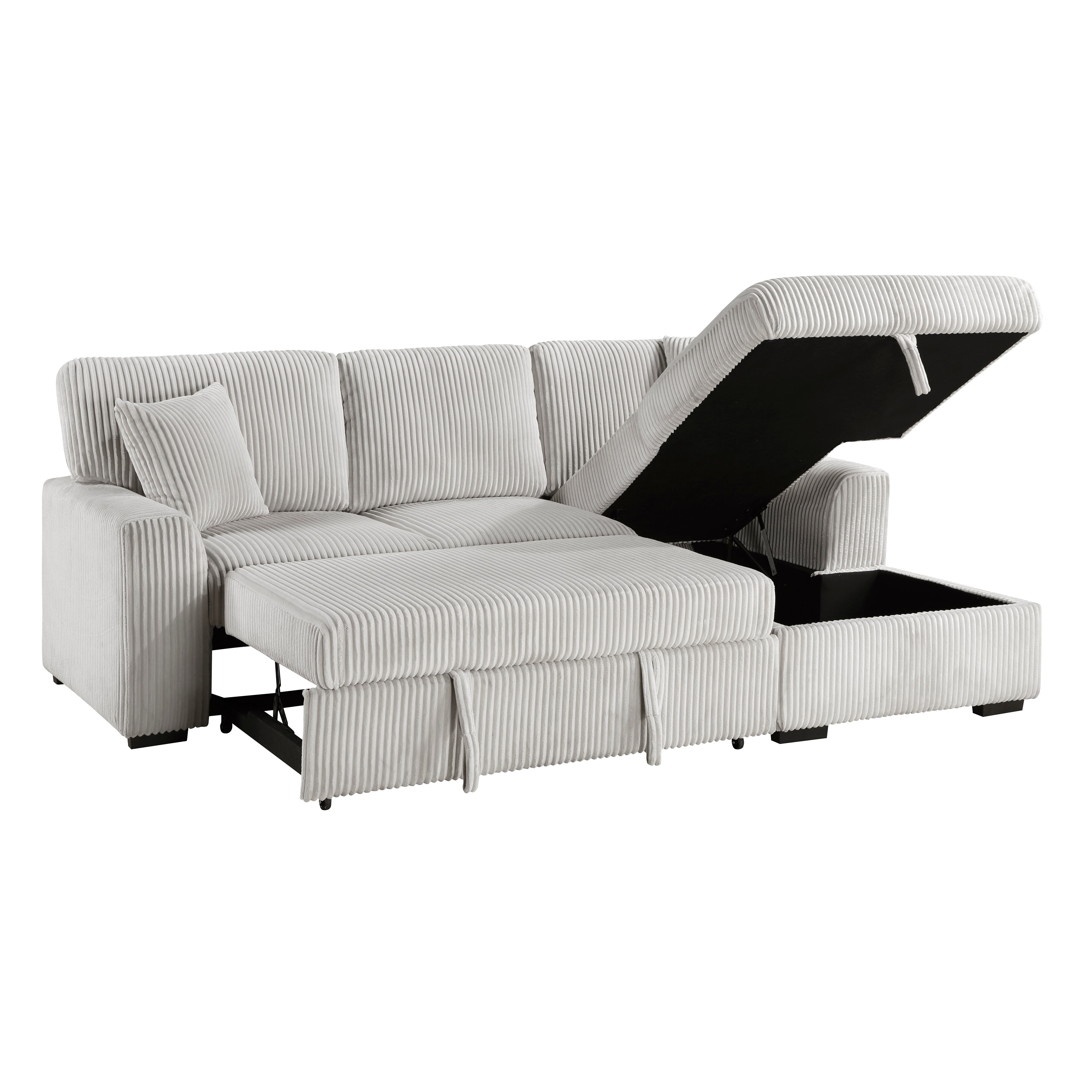 Configured for a perfect fit within your casual living room, the Marsh Collection's three seat sectional is a welcome combination of plush texture and convenient comfort. The pull-out bed that is stored beneath the left-side two-seat unit of the sofa, pops up to match length with the right-side storage chaise creating ample space for full leg extension. The lift-top seat of the chaise opens to reveal hidden storage perfect for blankets. Coordinating toss pillows are included and lend additional comfort to your seated experience. Plush corduroy upholstery covers the collection, its moonbeam-hue a neutral complement to your space.