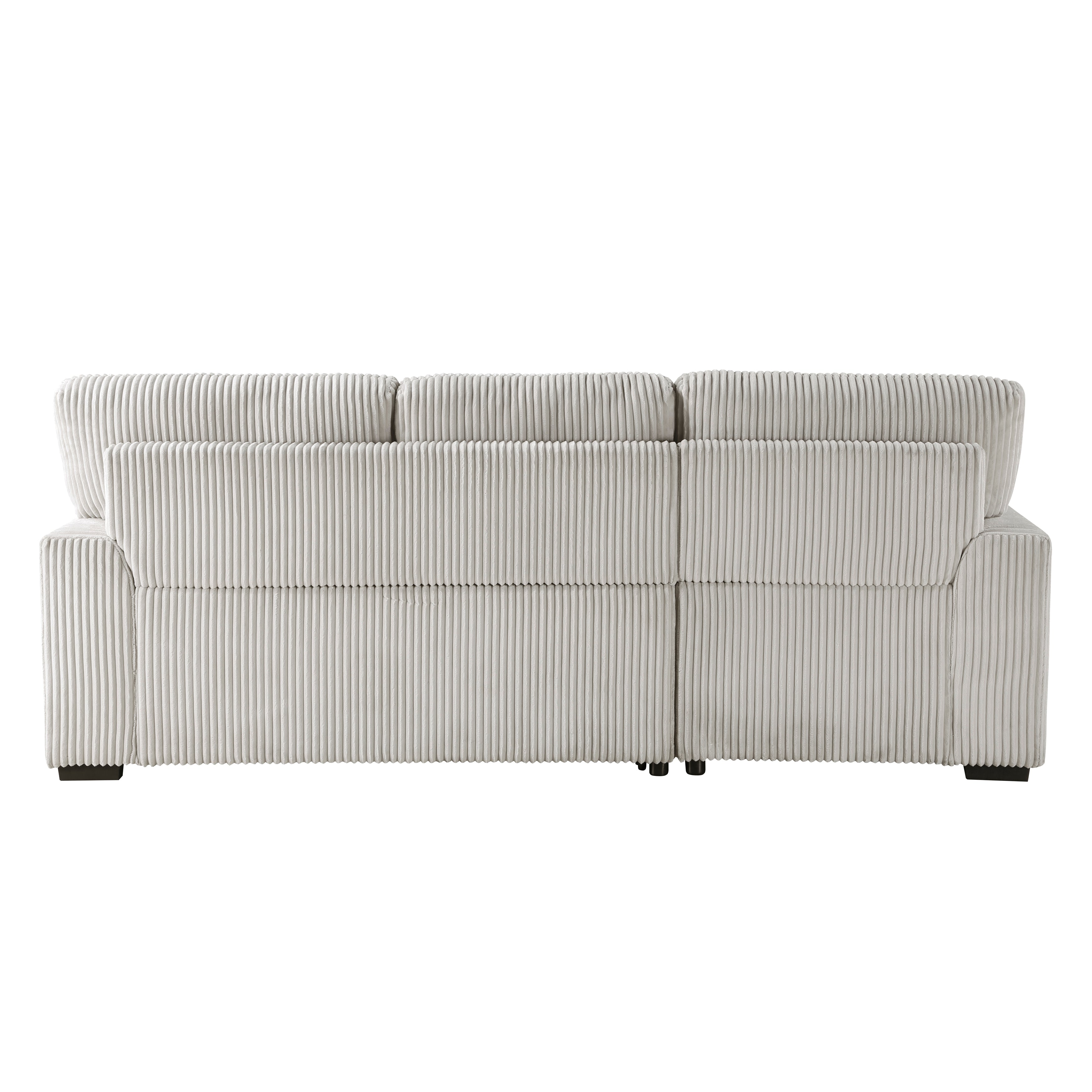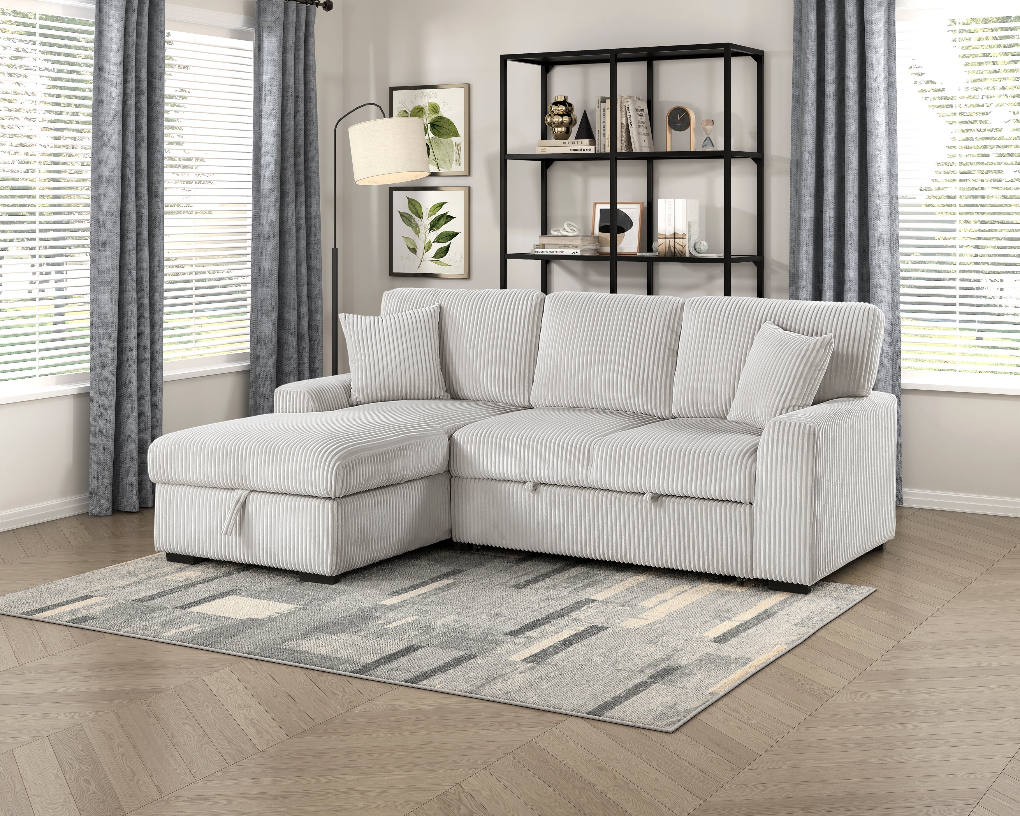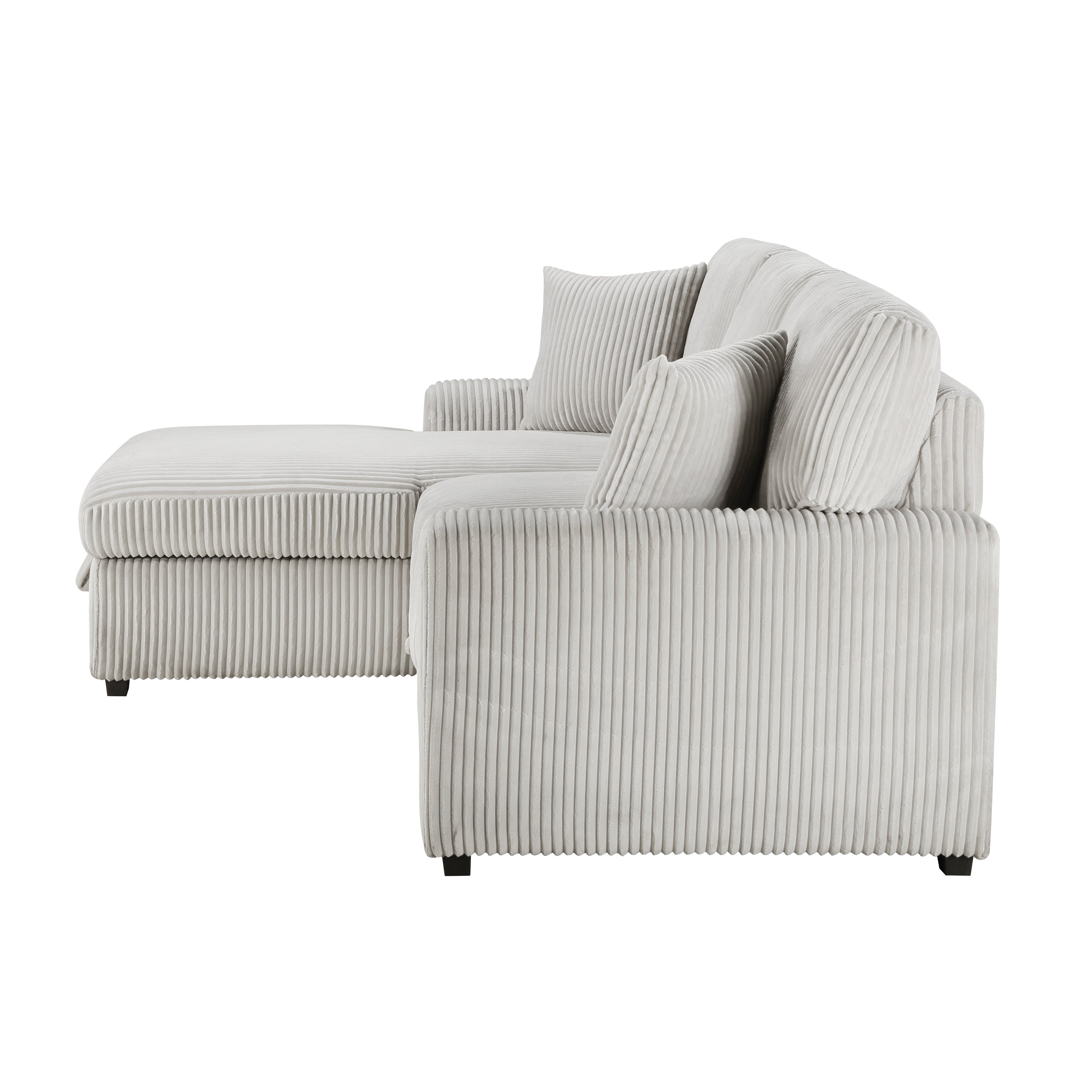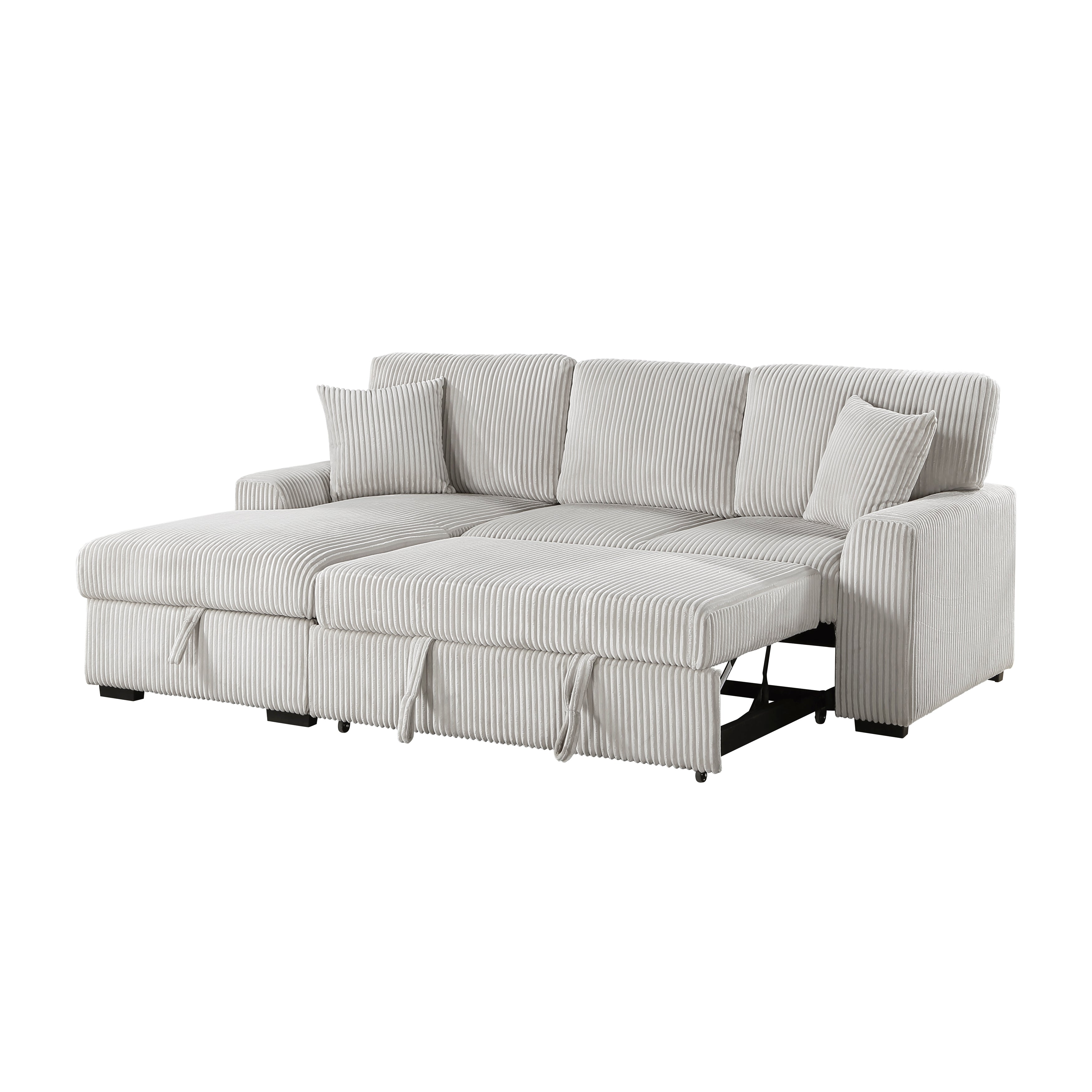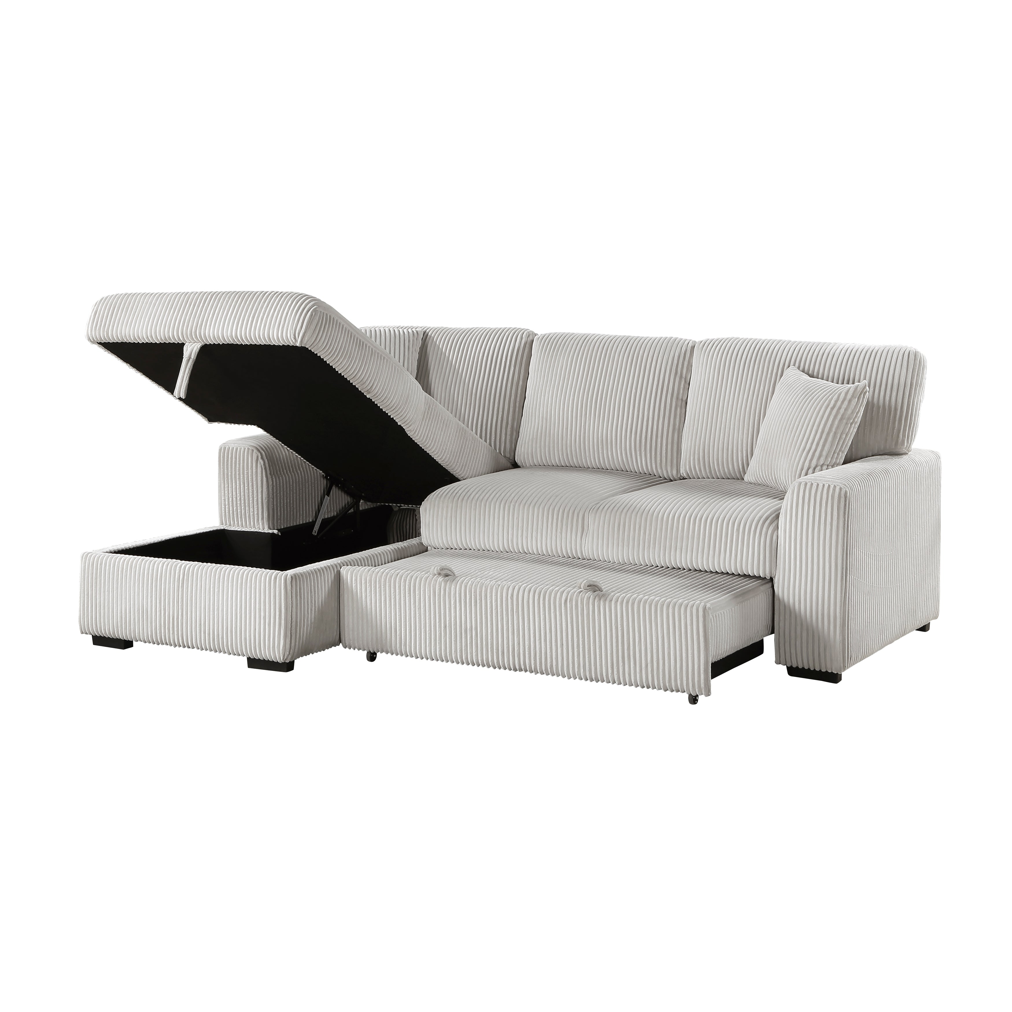 Configured for a perfect fit within your casual living room, the Marsh Collection's three seat sectional is a welcome combination of plush texture and convenient comfort. The pull-out bed that is stored beneath the right-side two-seat unit of the sofa, pops up to match length with the left-side storage chaise creating ample space for full leg extension. The lift-top seat of the chaise opens to reveal hidden storage perfect for blankets. Coordinating toss pillows are included and lend additional comfort to your seated experience. Plush corduroy upholstery covers the collection, its moonbeam-hue a neutral complement to your space.