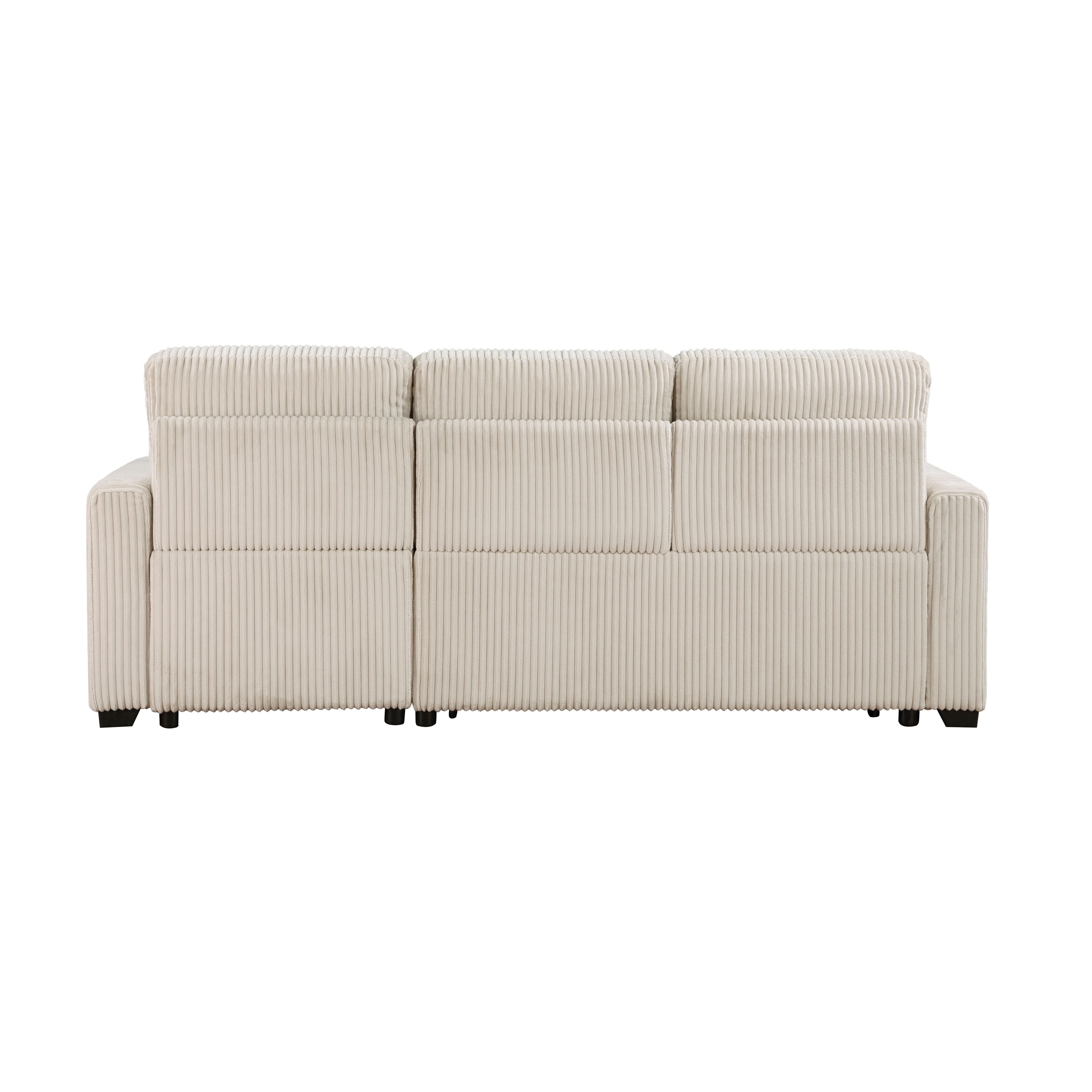 Whether seated or laying down, the design of the Rhett Collection utilizes hidden storage, and convertibility to achieve a welcome spot for relaxation. The reversible configuration of the three-seat sectional creates the option of a left or right chaise placement for a perfect fit within your casual living room. The pull-out bed that is stored beneath the two-seat unit of the sofa, pops up to match length with the storage chaise creating ample space for full leg extension. The lift-top seat of the chaise opens to reveal hidden storage perfect for blankets and pillows. Plush corduroy upholstery covers the collection, its beige hue a neutral complement to your space.