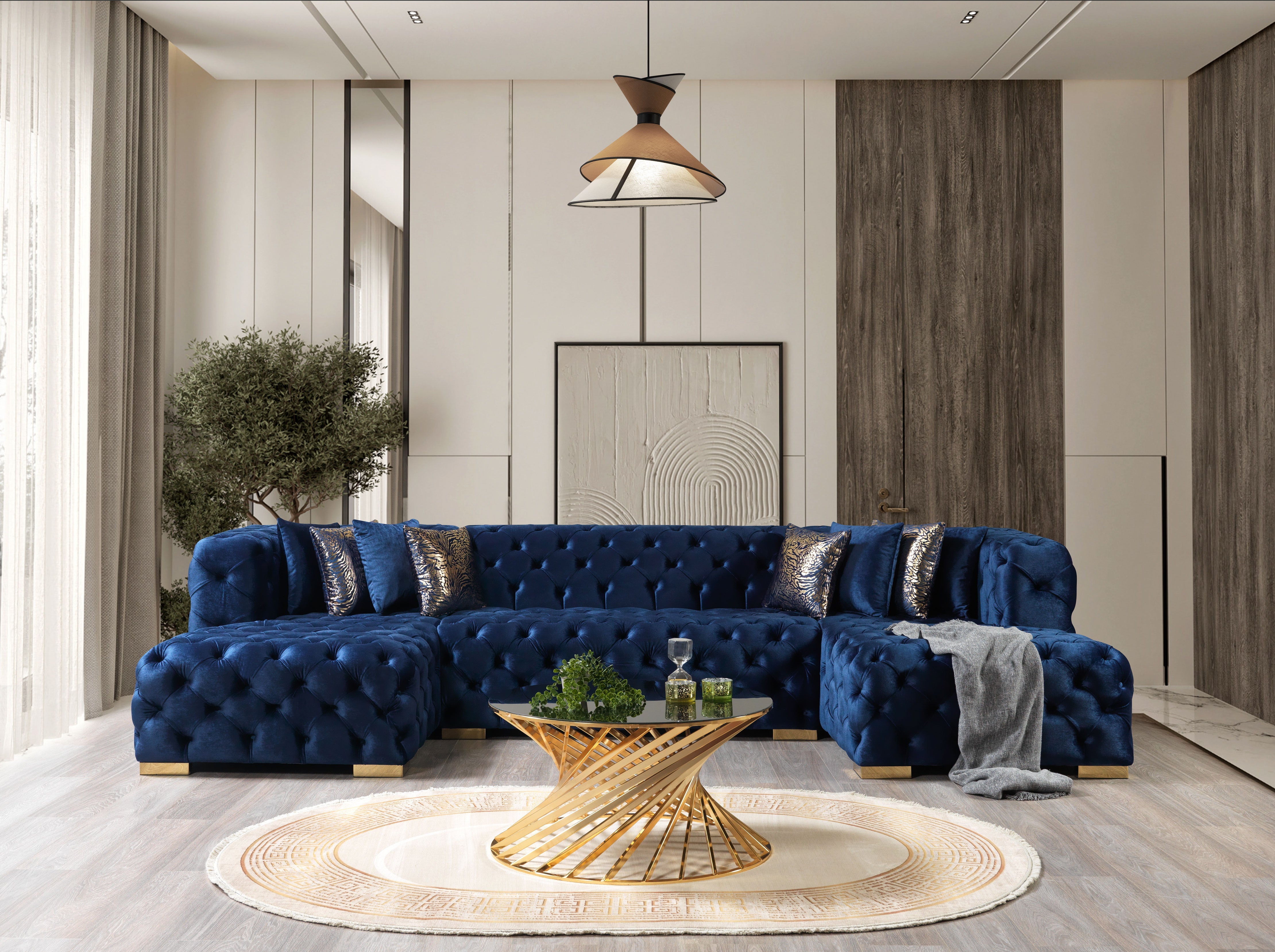 Immerse yourself in the epitome of modern luxury with the Neva Blue Velvet Double Chaise Sectional, a masterpiece that commands attention in any living room. Envision gatherings of friends or family lounging in style, enveloped by the plush embrace of rich royal blue velvet. Its fully tufted design and opulent gold-accented block legs instantly elevate the ambiance, balancing comfort with a bold, glamorous aesthetic. This sectional is more than just seating; it is a statement piece that transforms ordinary spaces into extraordinary ones—ideal for both lively entertainment and tranquil relaxation. Whether you're hosting an elegant soiree, enjoying a cozy movie night, or finding that perfect corner to read, the Neva Sectional provides a sumptuous retreat tailored for sophisticated tastes. Luna Furniture introduces Neva Blue Velvet Double Chaise Sectional to enhance the beauty of your living spaces.