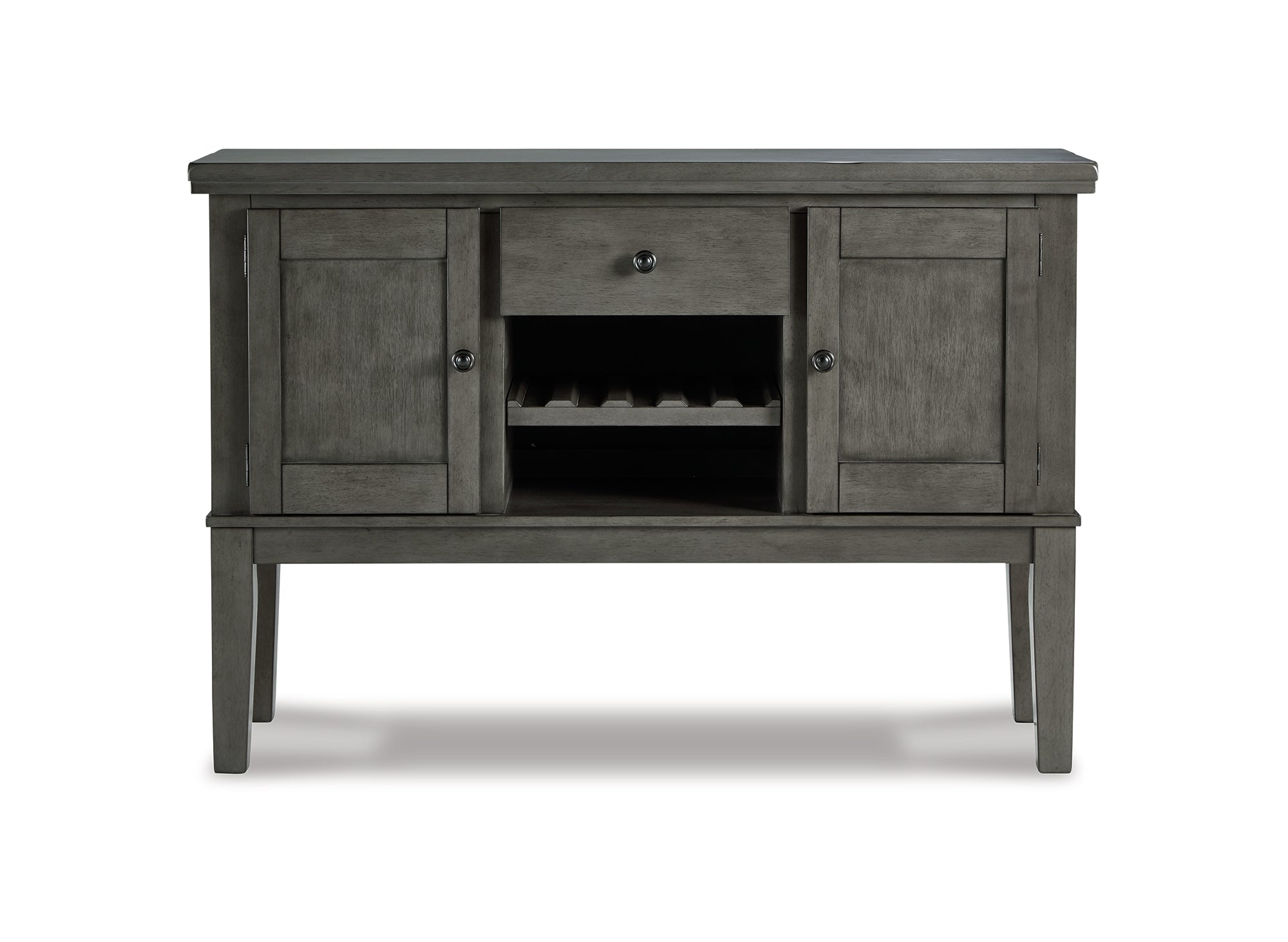 Cool and on-trend. This versatile server sports an antiqued gray color for a contemporary-yet-casual feel. The server features two cabinets, a smooth-gliding drawer and an open cubby with a wine rack, making it a breeze to clear away clutter and expand your serving space. Dining with friends and family has never been so stylish. — Luna Furniture introduces Hallanden Dining Server to enhance the beauty of your living spaces.