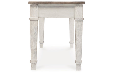 - Two-tone finish: The collection features a distinctive two-tone finish with a warm brown tabletop and a distressed grayish-white base, creating a visually appealing contrast.