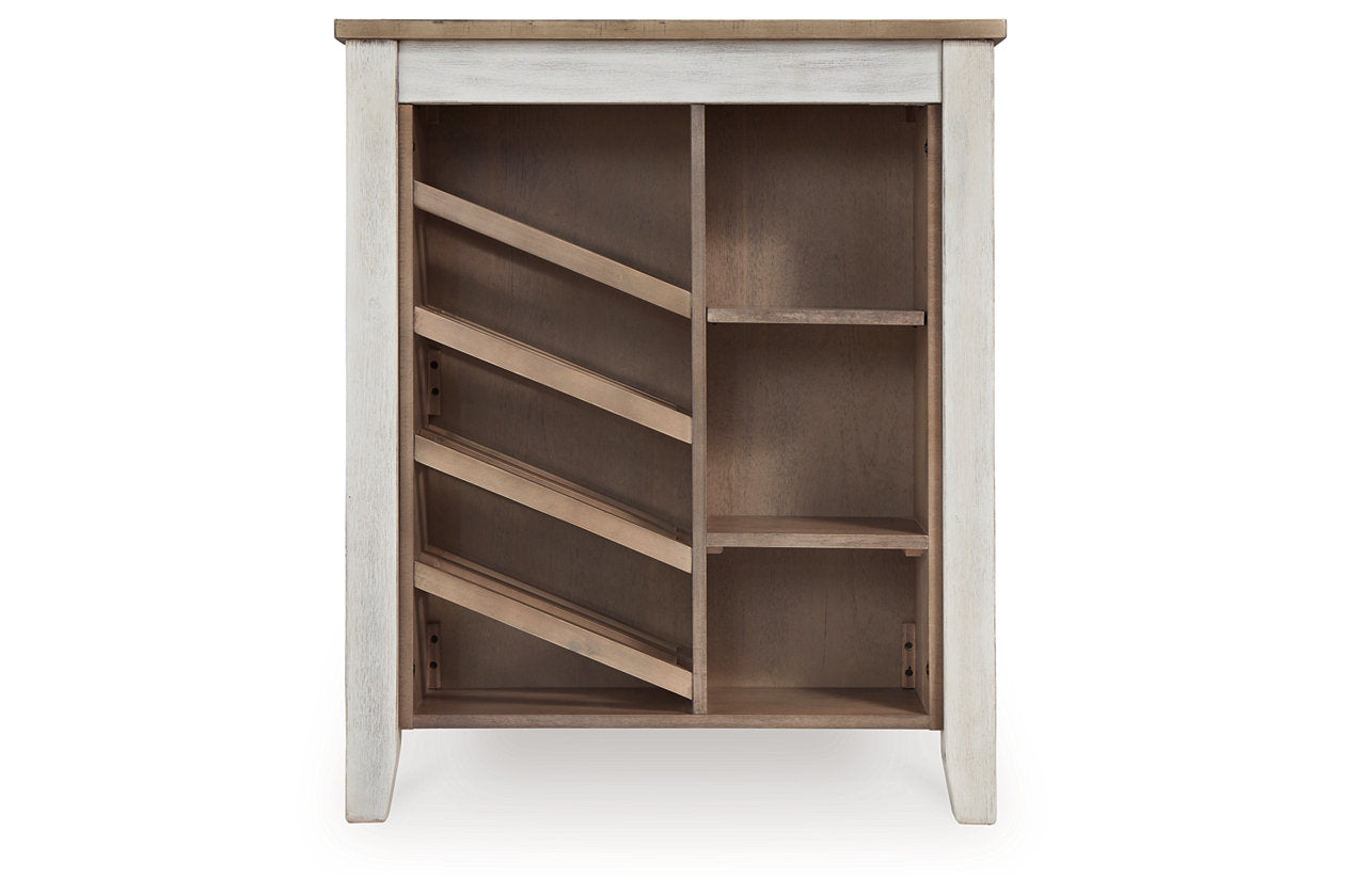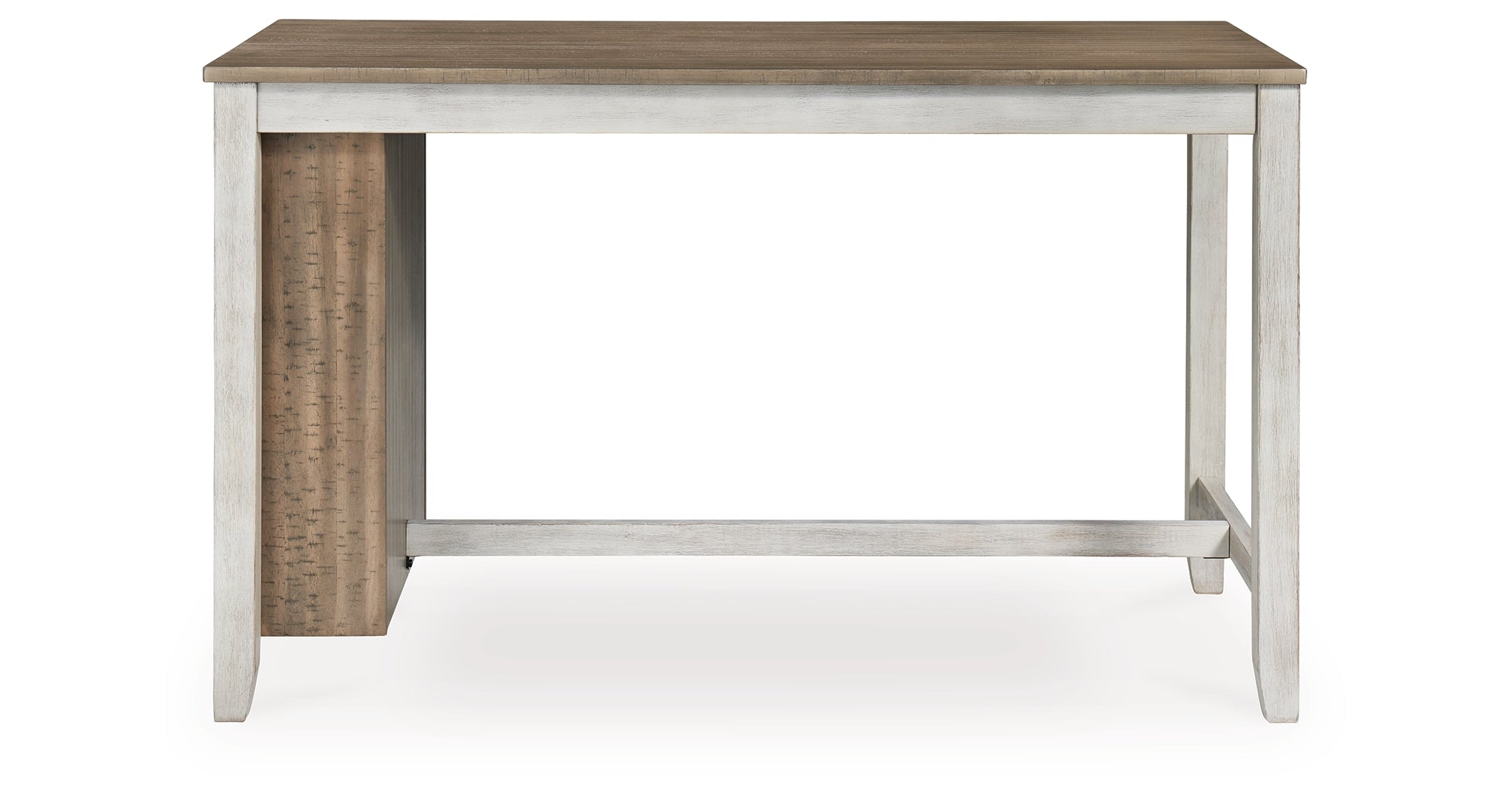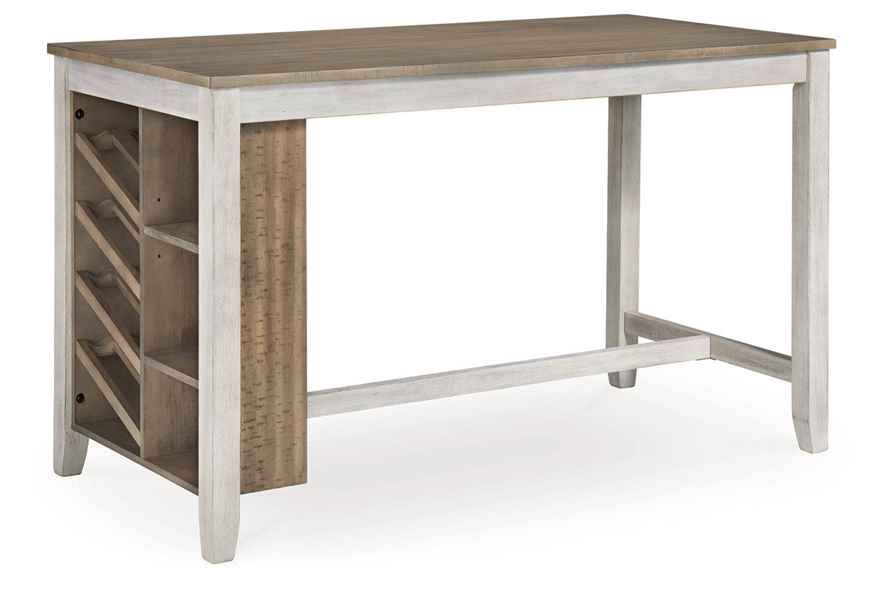 This counter height table with storage and 6 matching barstools invites you to raise the bar on small space living. An inspired choice for coastal chic or modern farmhouse settings, this clean-lined, simply striking table doubles the charm with a brown tone top with plank effect, paired with a grayish white base with rub through effect for timeworn appeal. Built-in 8-bottle wine rack and pair of open shelves make the most of every inch of space. Luna Furniture introduces Skempton Counter Height Dining Table and 6 Barstools to enhance the beauty of your living spaces.