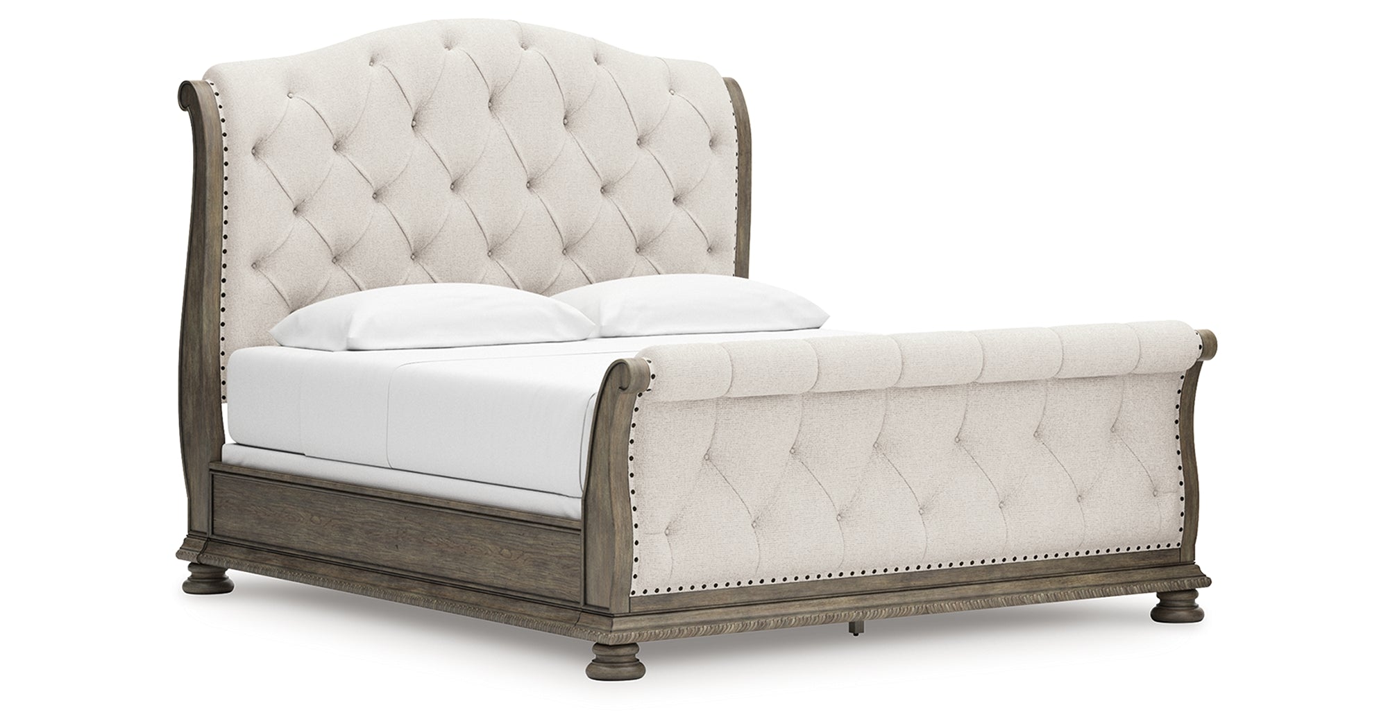 Ardenfield California King Upholstered Sleigh Bed with Mirrored Dresser, Chest and Nightstand in Light Brown