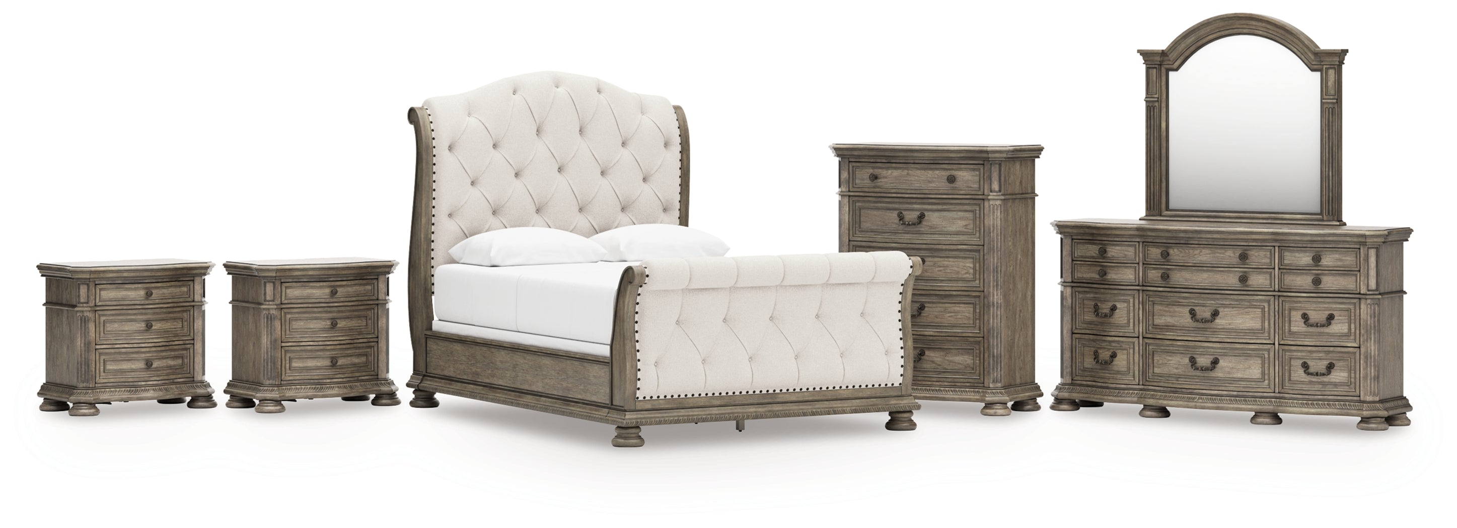 Ardenfield Queen Upholstered Sleigh Bed with Mirrored Dresser, Chest and 2 Nightstands in Light Brown