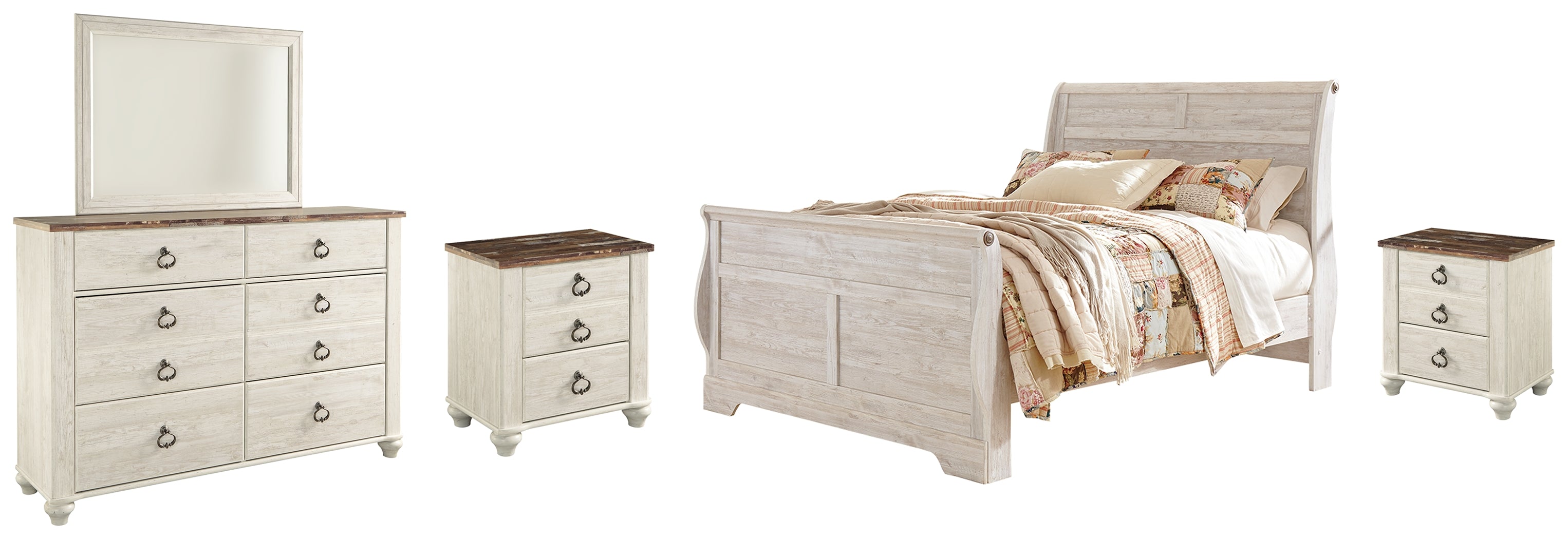 Willowton Queen Sleigh Bed with Mirrored Dresser and 2 Nightstands in Whitewash