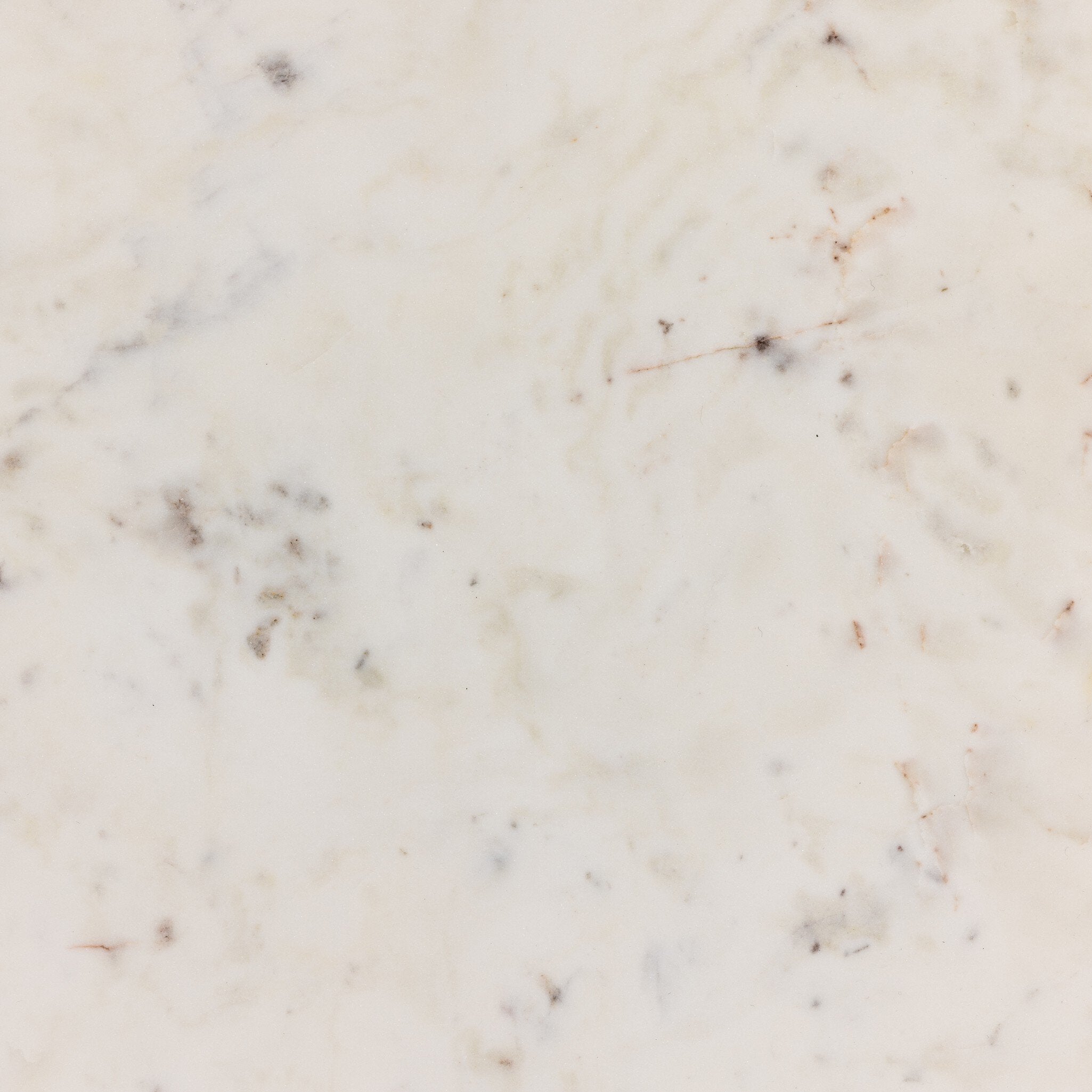 - Hammered grey-finished iron frames three tiers of polished white marble, for an open look with plenty of surface space.