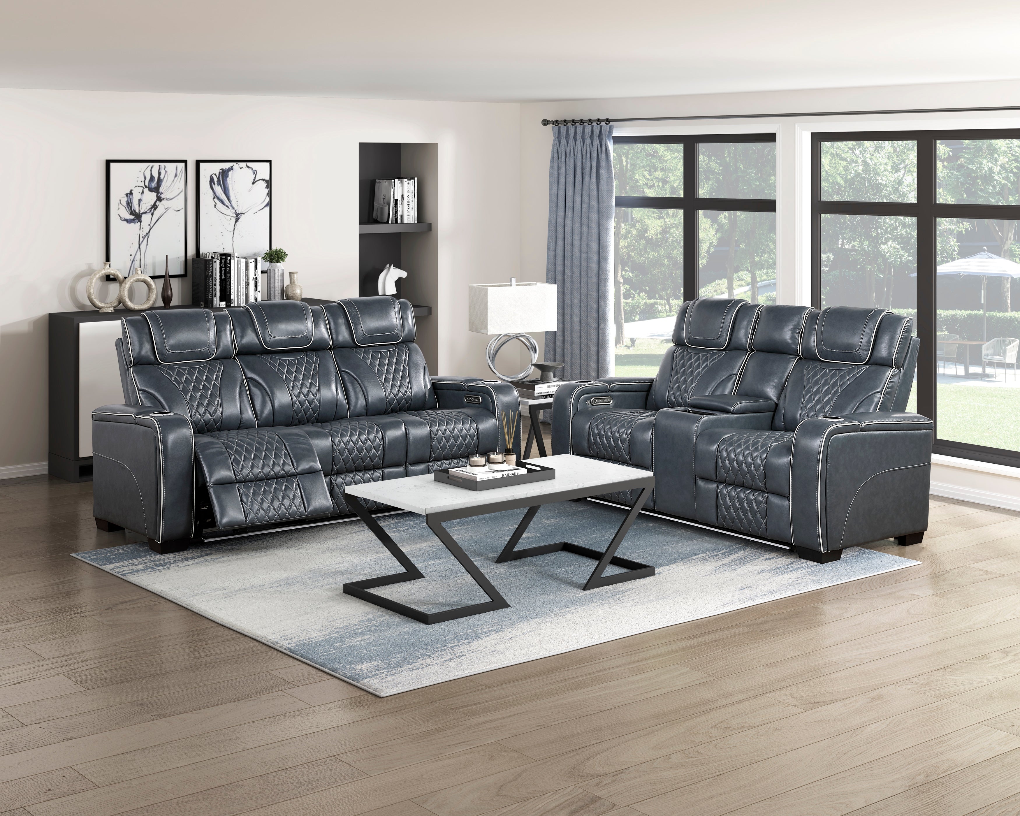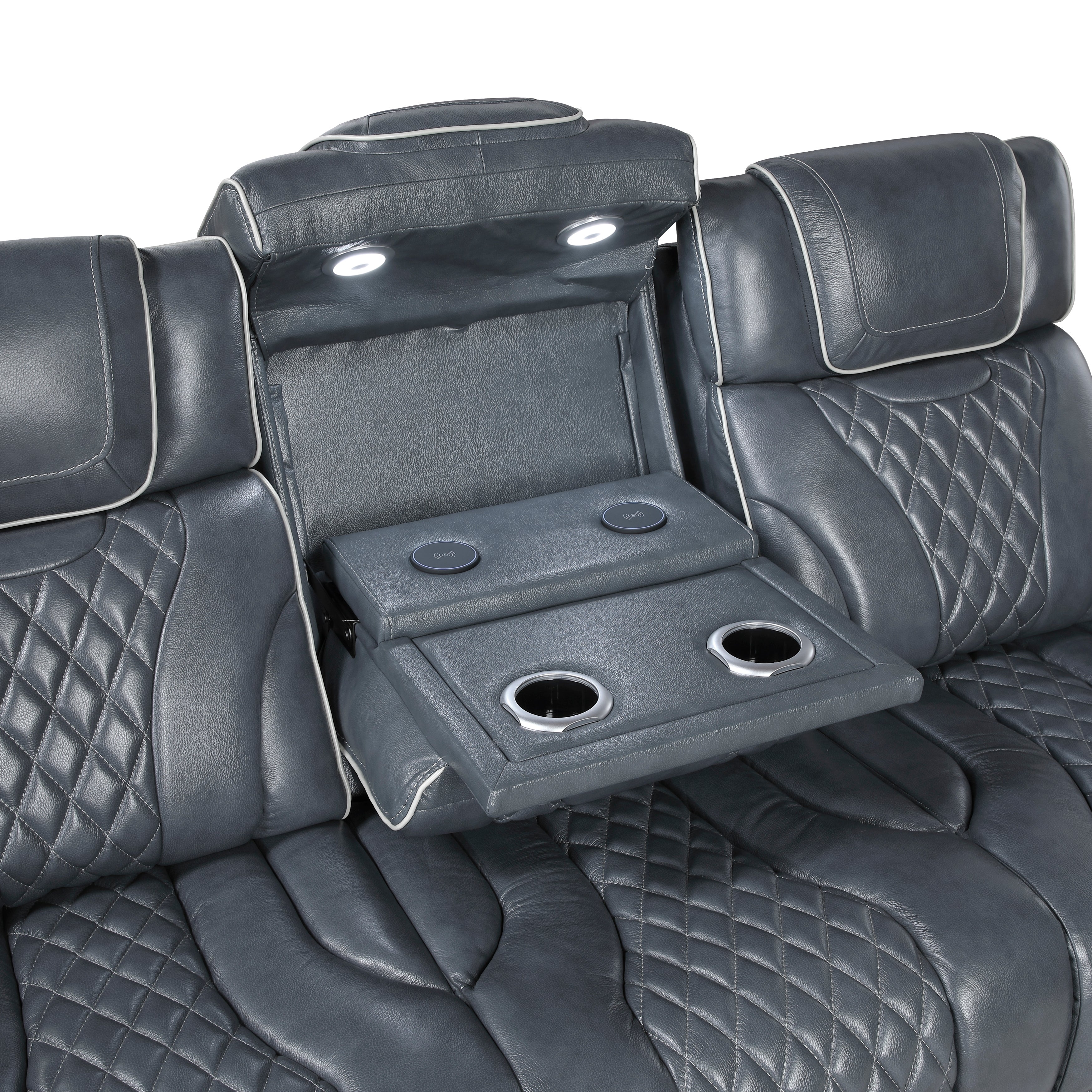 Power Double Reclining Sofa with Center Drop-Down Cup Holders, Power Headrests, Storage Arms with Cup holders, Reading Lights, Wireless Charger, Air Massage and Heat, LED Lighting and Charging Ports