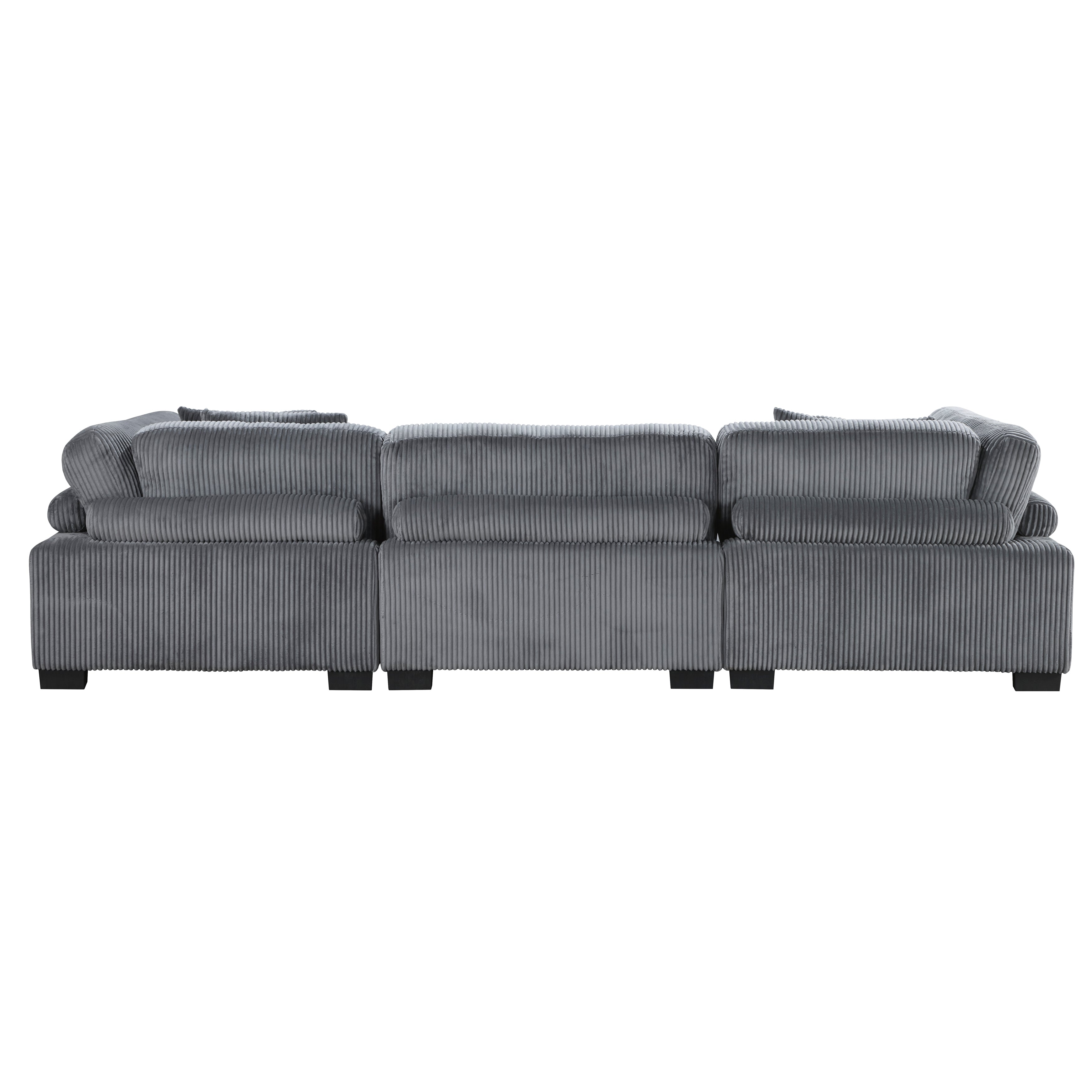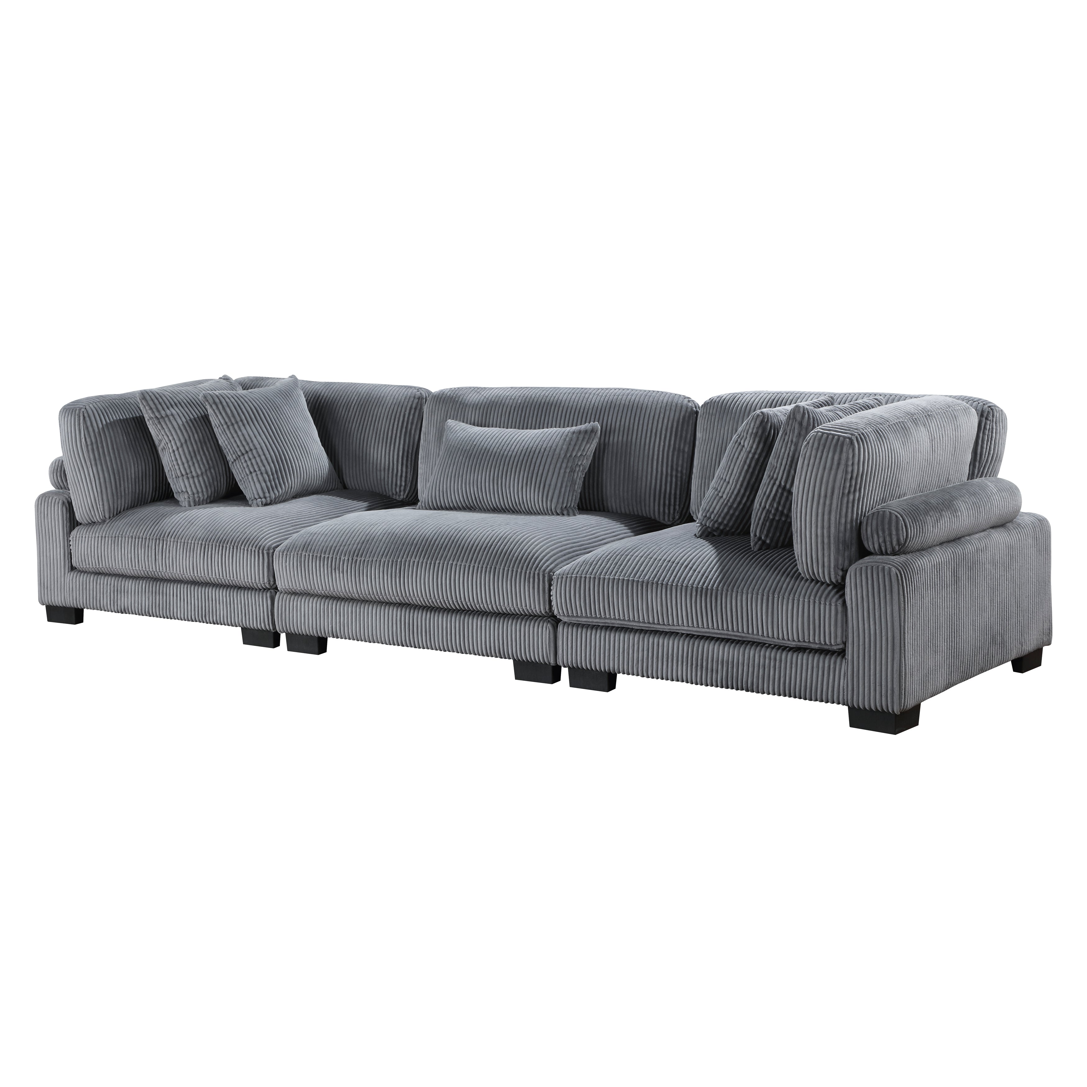 Configurable to your available space, the Traverse Collection allows for the addition and detachment of pieces for a customized seating experience. The sofa configuration consists of two corner units paired with a centrally placed armless chair. The gray corduroy fabric upholstery creates a plush expanse for a soft touch experience. The corner seat features two toss pillows, adjustable back and arm rest, and reversible cushions. The armless chair features a lumbar pillow, and reversible cushions.
