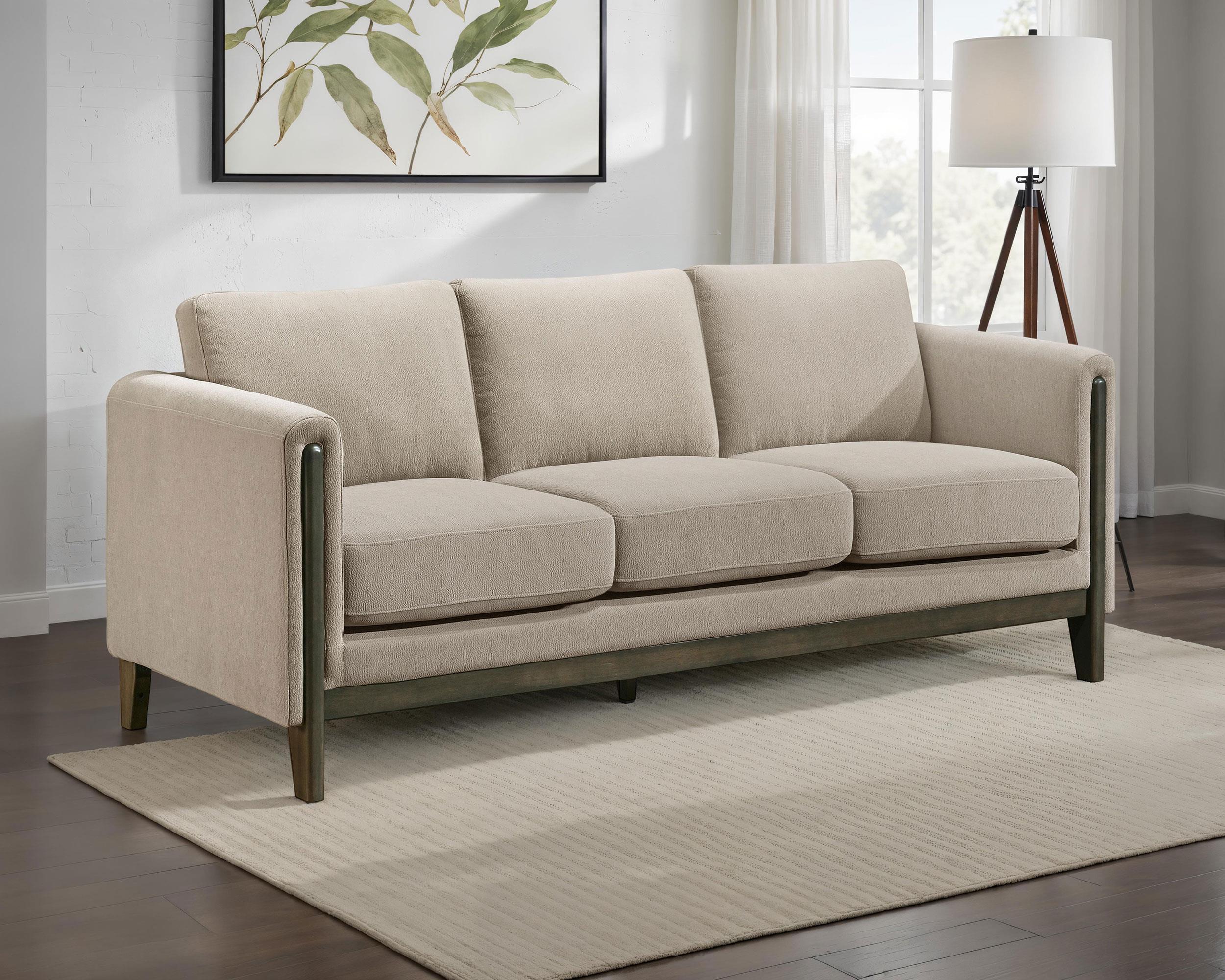 Rooted in clean lines and modern comfort, this upholstered sofa offers a grounded yet welcoming presence. Its solid rubberwood frame in a rich coffee finish defines the silhouette, while recessed panel arms add architectural interest. Upholstered in soft taupe polyester, the sofa features plush, reversible seat and back cushions for extended comfort and longevity. A refined blend of structure and softness for today’s living spaces.