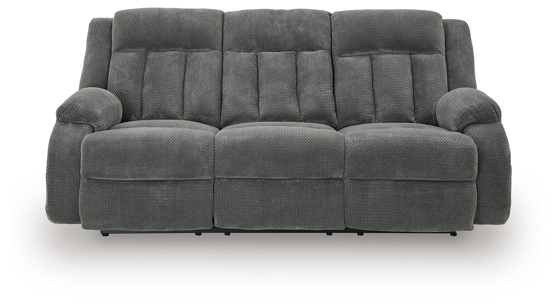 There's no need to sacrifice looks for comfort—this power reclining sofa with drop-down table serves up both, plus a richly relaxed sense of style. Its steel-hued velvet upholstery is ultra soft, with a plush waffle weave for an added layer of interest. The overstuffed pillow top armrests are custom made for lazy afternoon catnaps. A one-touch power control takes the pleasure of reclining to a higher level, while cup holders and USB charging help keep essentials close by.