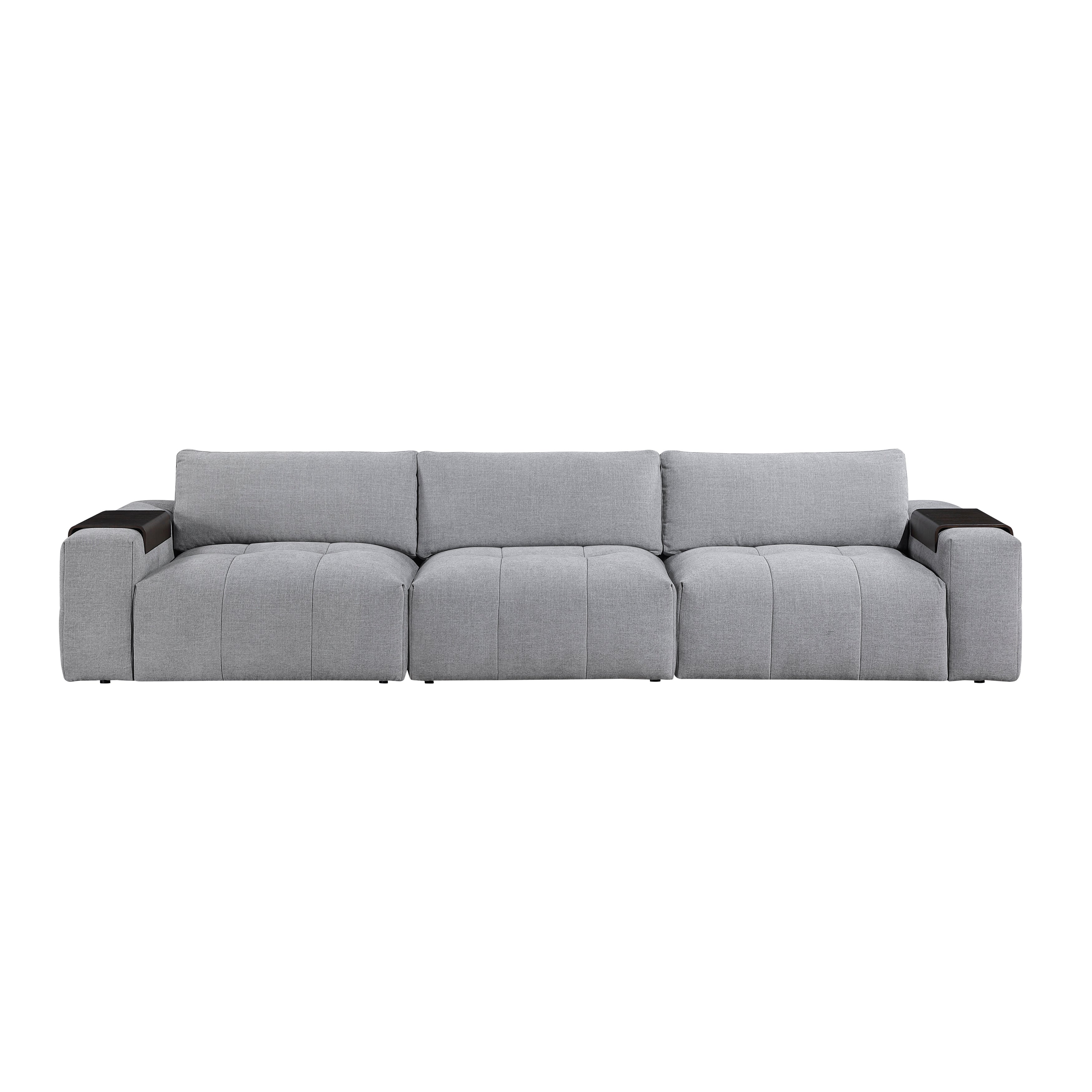 Redefine your lounging experience with this sophisticated three-seater gray sofa, designed to bring contemporary elegance and functional luxury to your home. Featuring premium textured fabric upholstery with refined tufting details, this large couch is built on a robust plywood frame for lasting durability. Each end includes an integrated wooden armrest tray, providing a stable surface for drinks or devices, while high-density foam cushions ensure plush, long-lasting comfort in any modern living room.