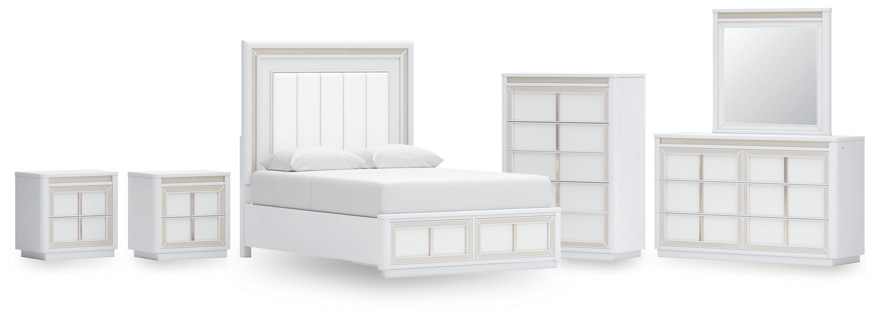 Chalanna Queen Upholstered Storage Bed with Mirrored Dresser, Chest and 2 Nightstands in White
