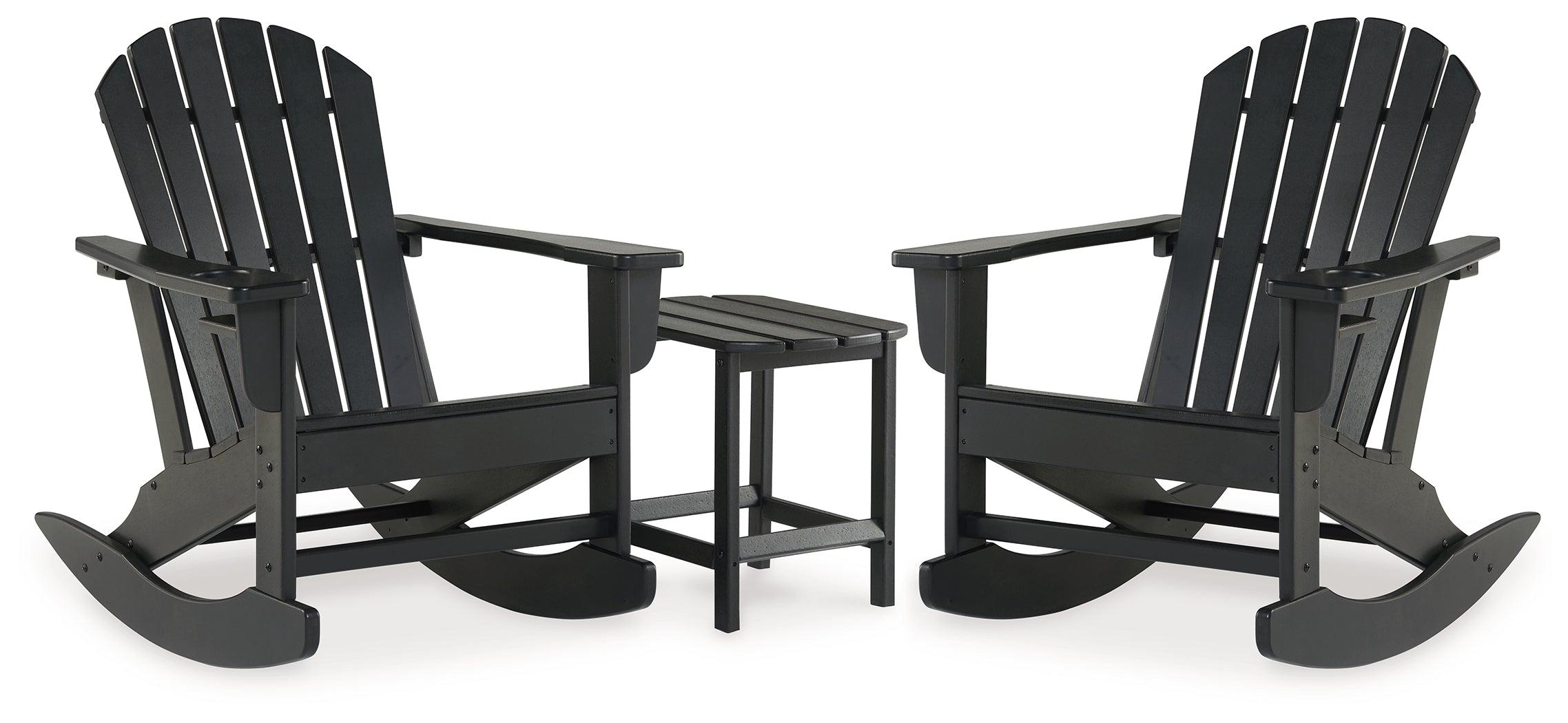 Add cottage-quaint charm to your outdoor oasis with this rocking chair and table set. Made of MEGA TUFF™ high-density polyethylene material, it’s sure to weather the seasons beautifully. Designed to shed rainwater, the slatted styling and classic Adirondack design provide exceptional form and function.