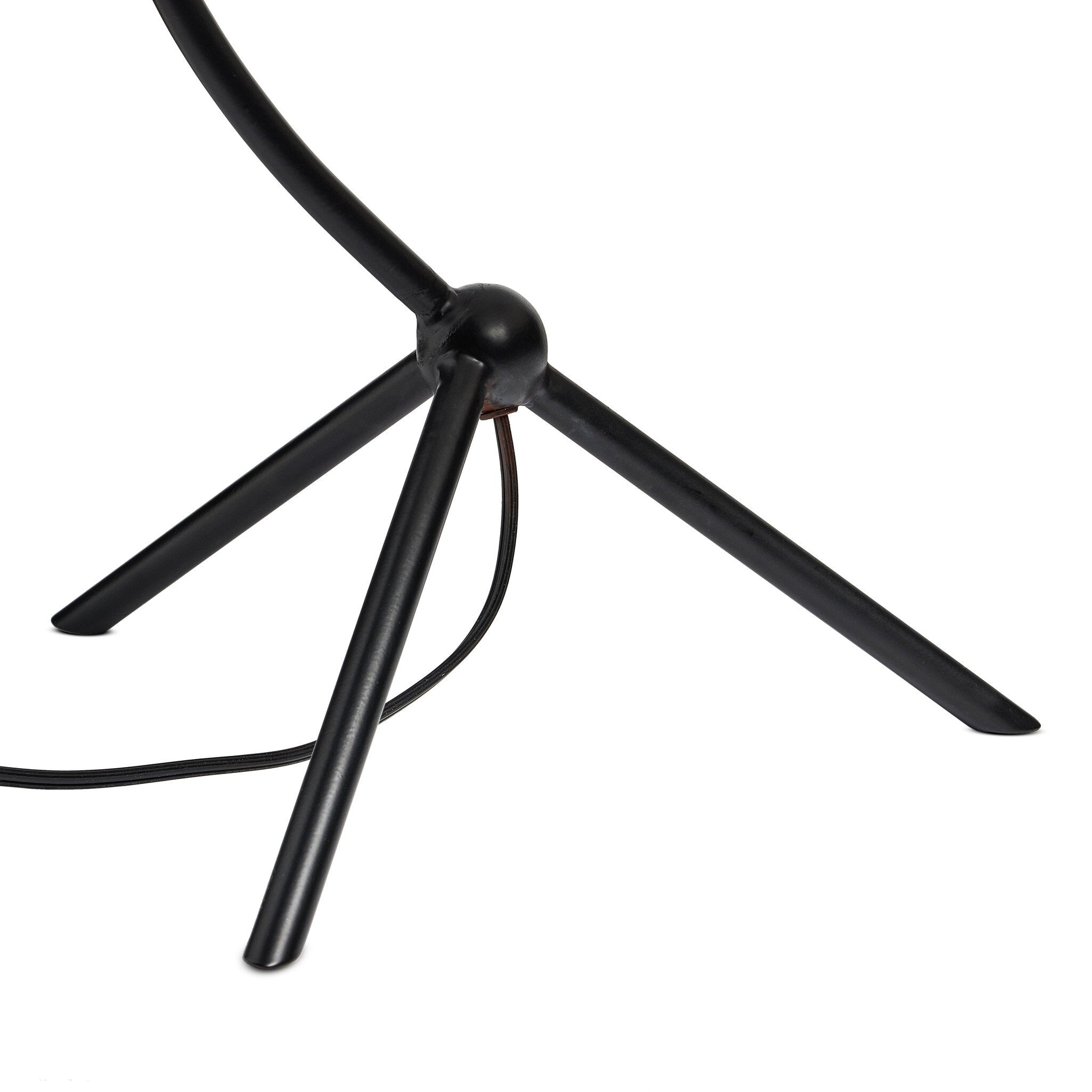 - A dramatically curved silhouette and tripod base of matte black metal pair with a flax linen shade for a shapely, minimalist feel.