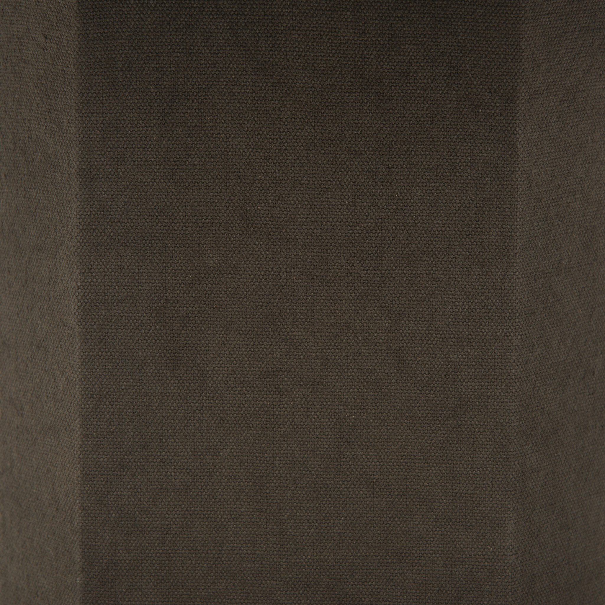 - Burnished brass iron in a pyramid shape gives an industrial feel to this lamp's dark green canvas base with softened corners.