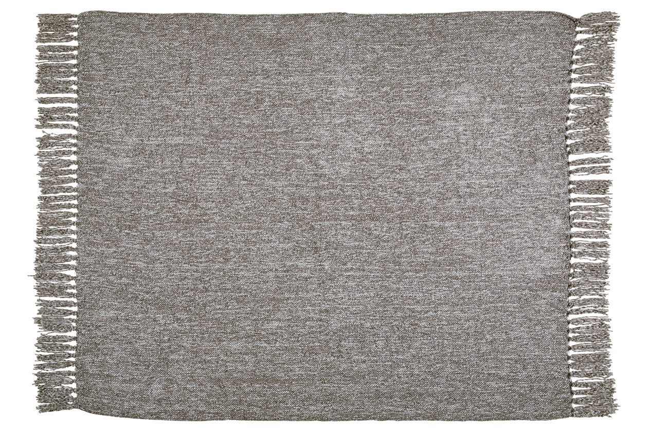 A lovely layer to cozy up with, this gray throw blanket also makes a stylish statement. Whether draped over the arm of a sofa or folded at the foot of a bed, the woven texture and knotted fringe give it a homespun look that's relaxed and inviting. — Luna Furniture introduces Tamish Throw (Set of 3) to enhance the beauty of your living spaces.