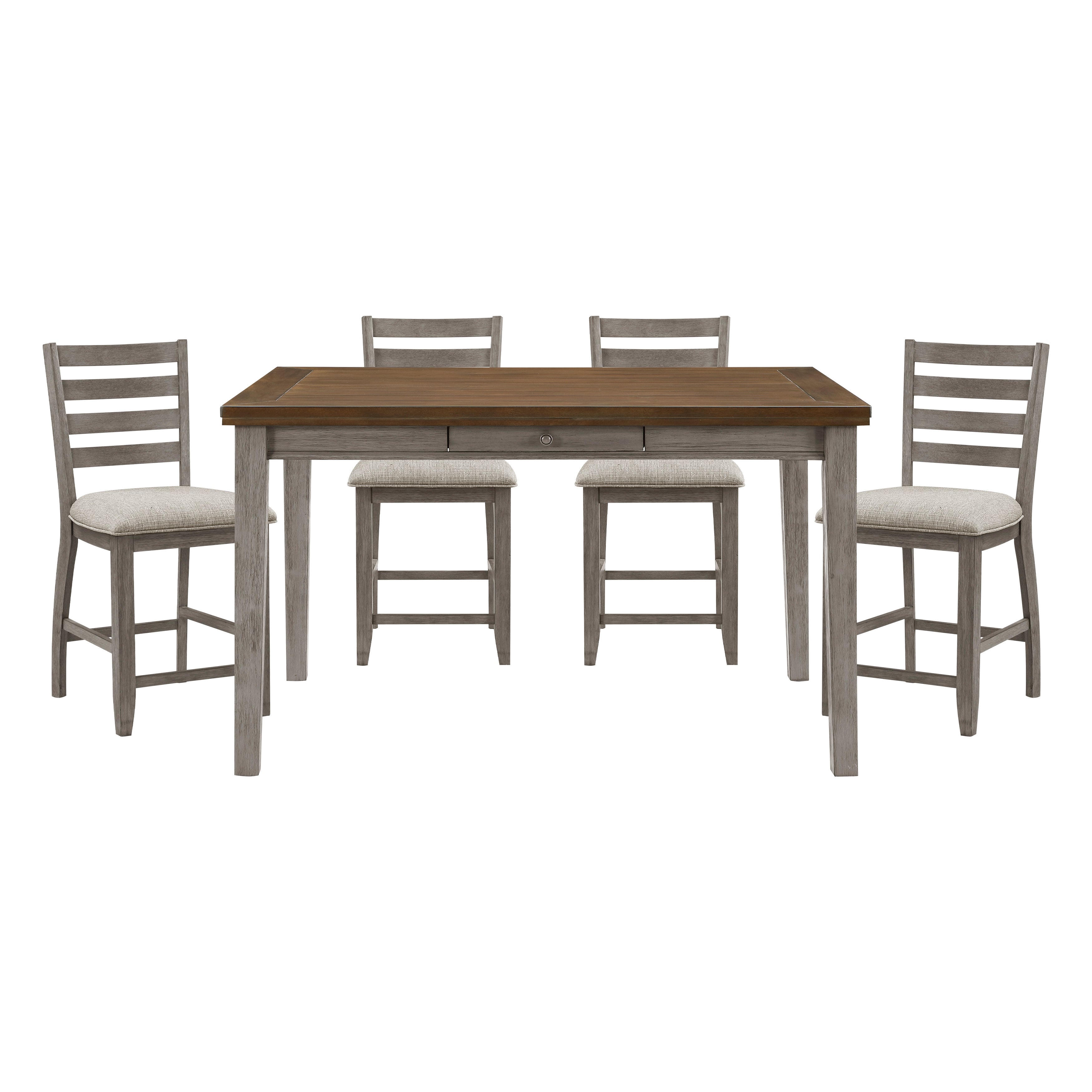 The traditional styling of the Tigard Collection lends timeless appeal to the look of your casual dining space. With subtle hints nodding to the Arts and Crafts design movement, the framed plank counter height tabletop, ladder back counter height chairs, and server each feature classic lines that solidify the versatile aesthetic of the collection. Covering the padded seats of the counter height side chairs is a neutral tone fabric upholstery, complementing the traditional two-tone cherry and gray finish of the collection’s acacia veneer.
