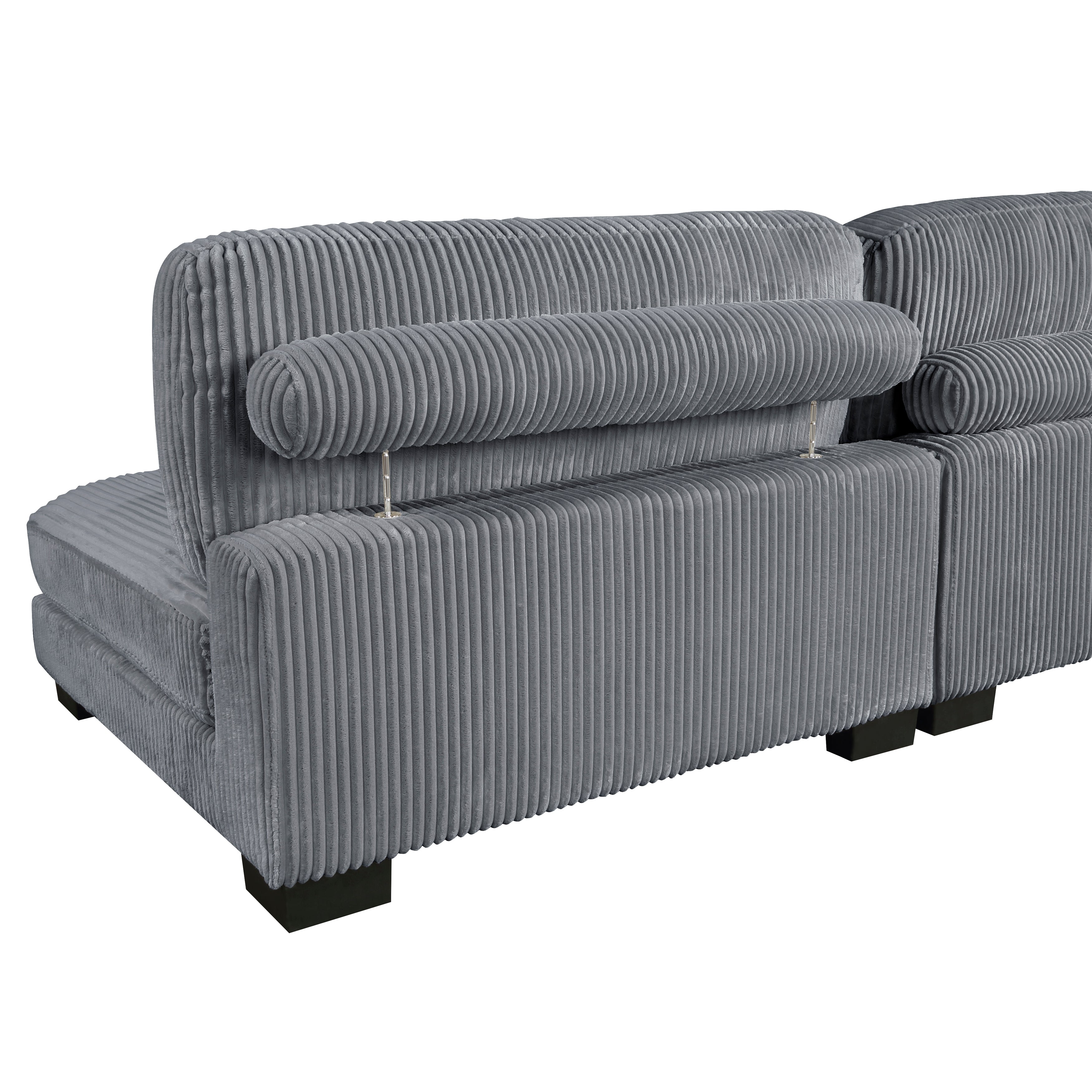 Configurable to your available space, the Traverse Collection allows for the addition and detachment of pieces for a customized seating experience. The 5-piece sectional configuration consists of two corner units paired with three armless chairs. The gray corduroy fabric upholstery creates a plush expanse for a soft touch experience. The corner seat features two toss pillows, adjustable back and arm rest, and reversible cushions. The armless chair features a lumbar pillow, and reversible cushions.