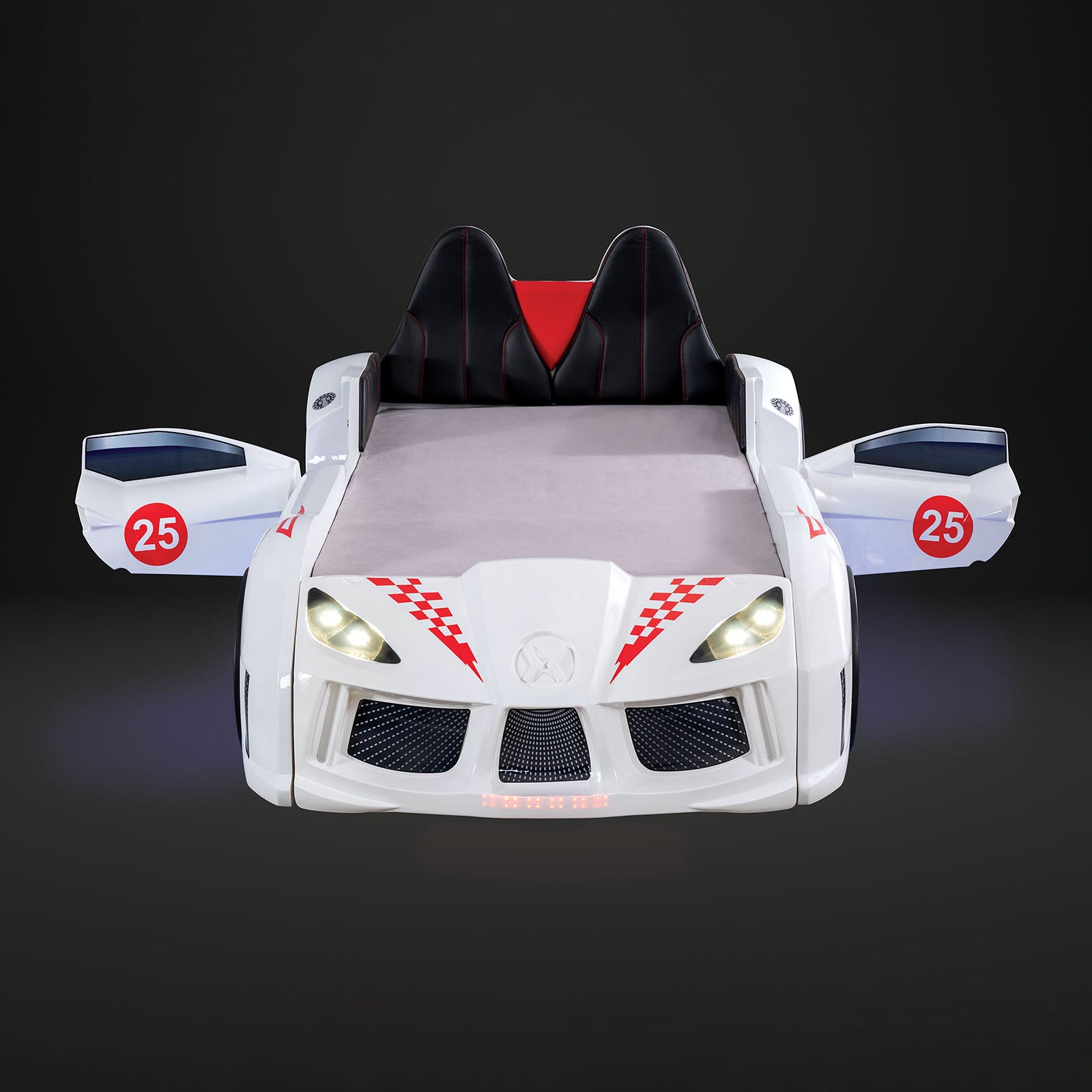 This sleekly designed race car bed comes in a variety of colors and styles for the future speed enthusiast. The wheels have embedded LED lighting, while the headlights double as a night light. Side doors swing open realistically and close magnetically, while the sides and headboard shaped like seats are upholstered in padded leatherette. But it's not just all about looks--the bed comes with a four-option music selections via wireless remote controller for maximum bedtime fun!