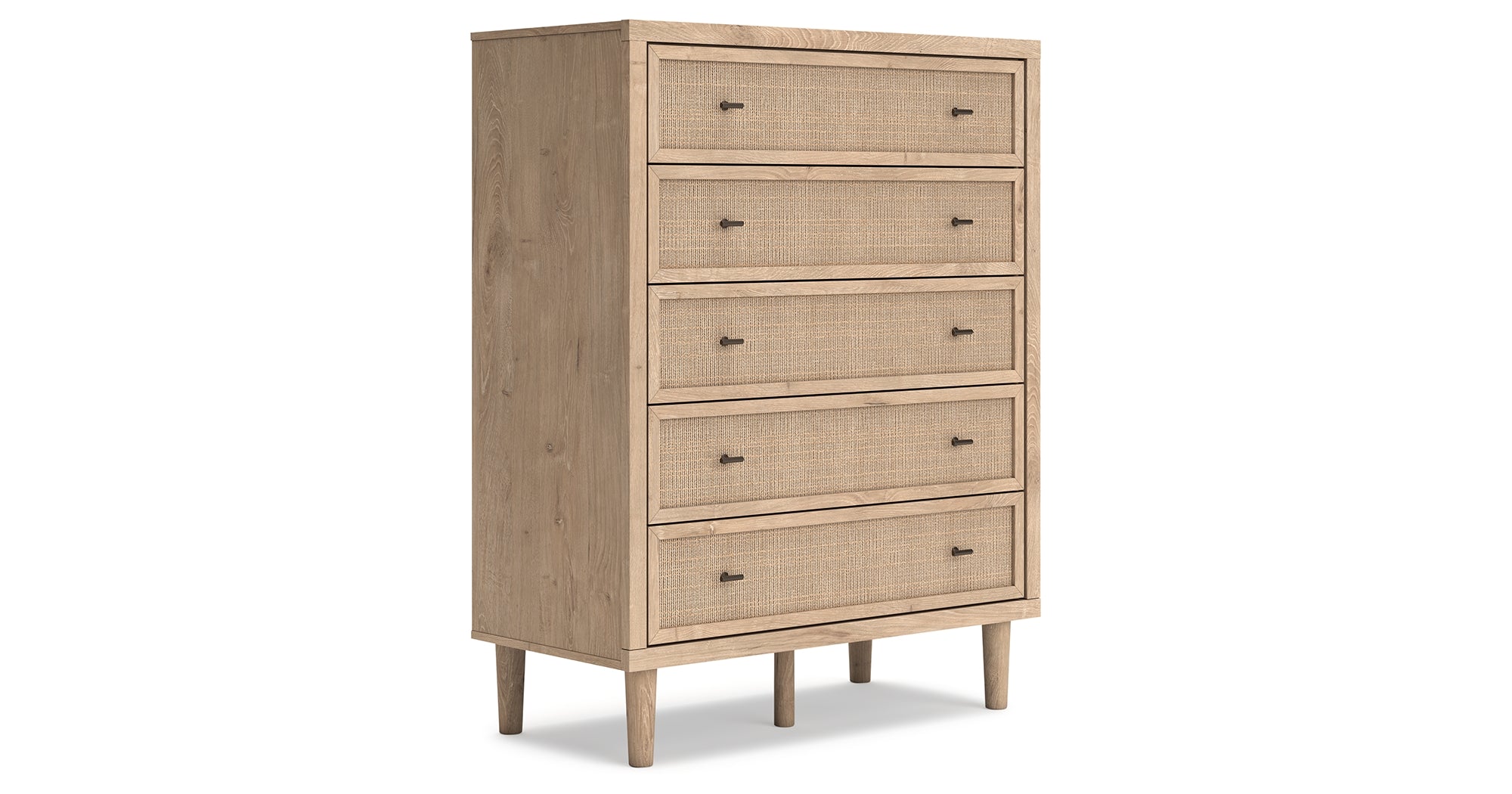 Clean-lined and contemporary—but far from stark—this chest of drawers is a fresh style awakening. Pairing a light finish with replicated oak grain and textured beige details that replicate the look of cane, its mixed materials bring a naturally versatile vibe to your bedroom. Sleek, simple hardware plays perfectly with the modern aesthetic. Prepare to have your mind blown by the vast universe of possibilities that await within the spacious drawers. — Luna Furniture introduces Cielden Chest of Drawers to enhance the beauty of your living spaces.