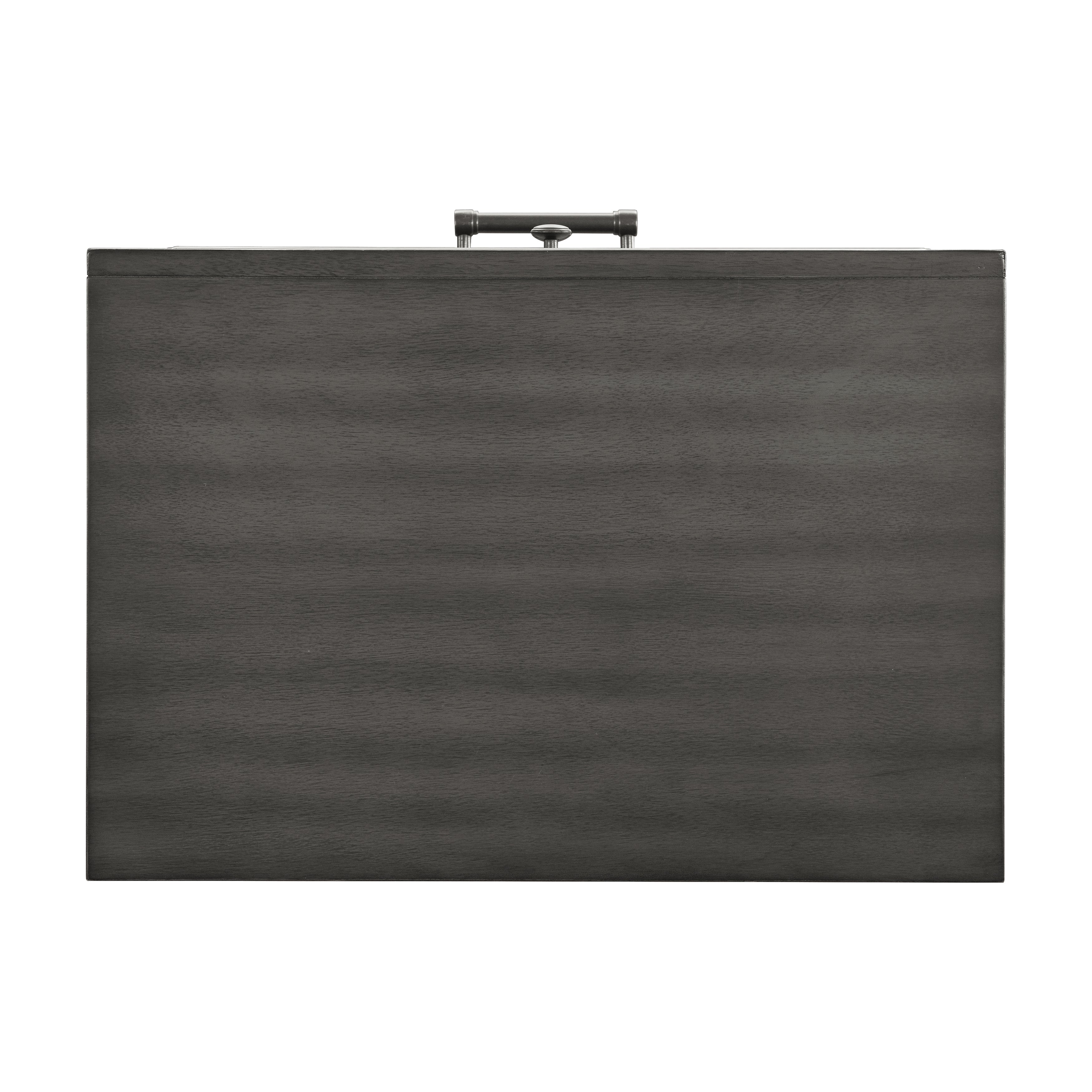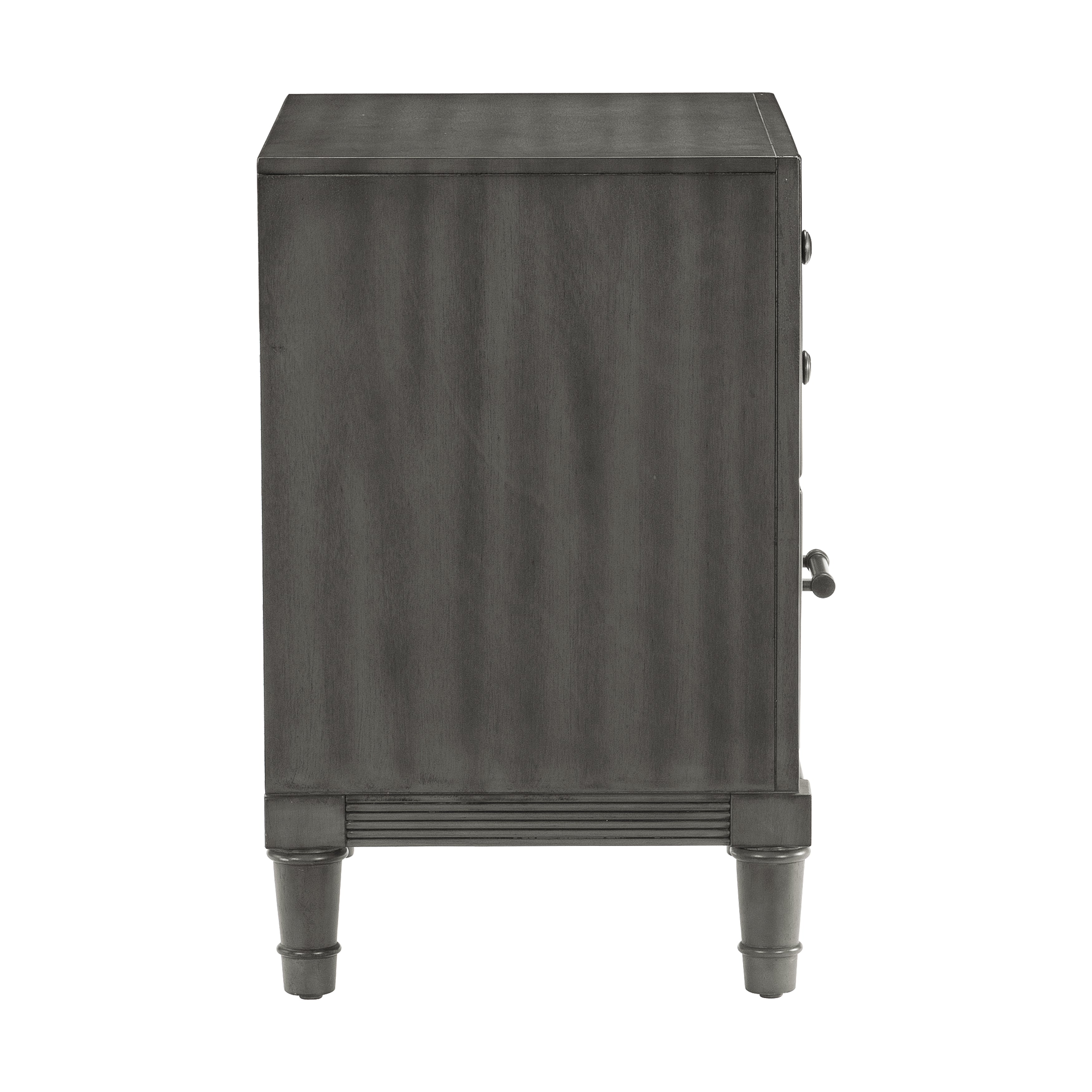 Modern convenience is paired with transitional style to create the versatile look of the Wittenberry Collection. The nightstand’s gray finish over okume veneer is complemented by the dark bronze finished knob and bar hardware that fronts the framed drawers of the piece.