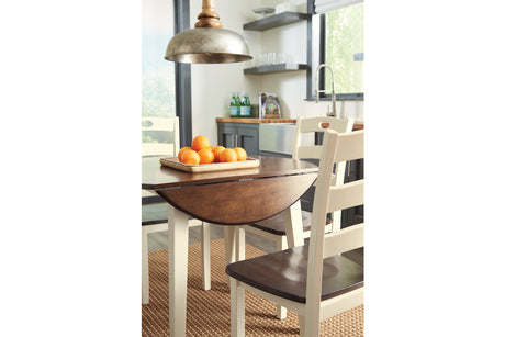 Dining Chairs: The chairs usually have a ladderback design with a pierced splat, adding a touch of traditional style. They often have a cream-colored finish on the frame and a medium brown finish on the seat, complementing the table's two-tone design.