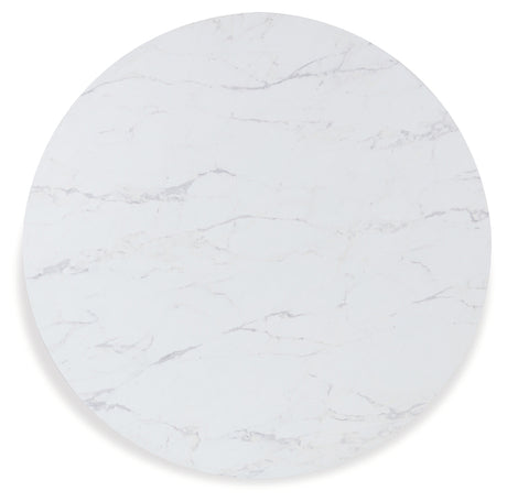 Dining Table: The dining table often showcases a round or rectangular top with a replicated white marble finish, adding a touch of sophistication. The base might feature chunky round post legs in a contrasting black finish for a bold statement.
