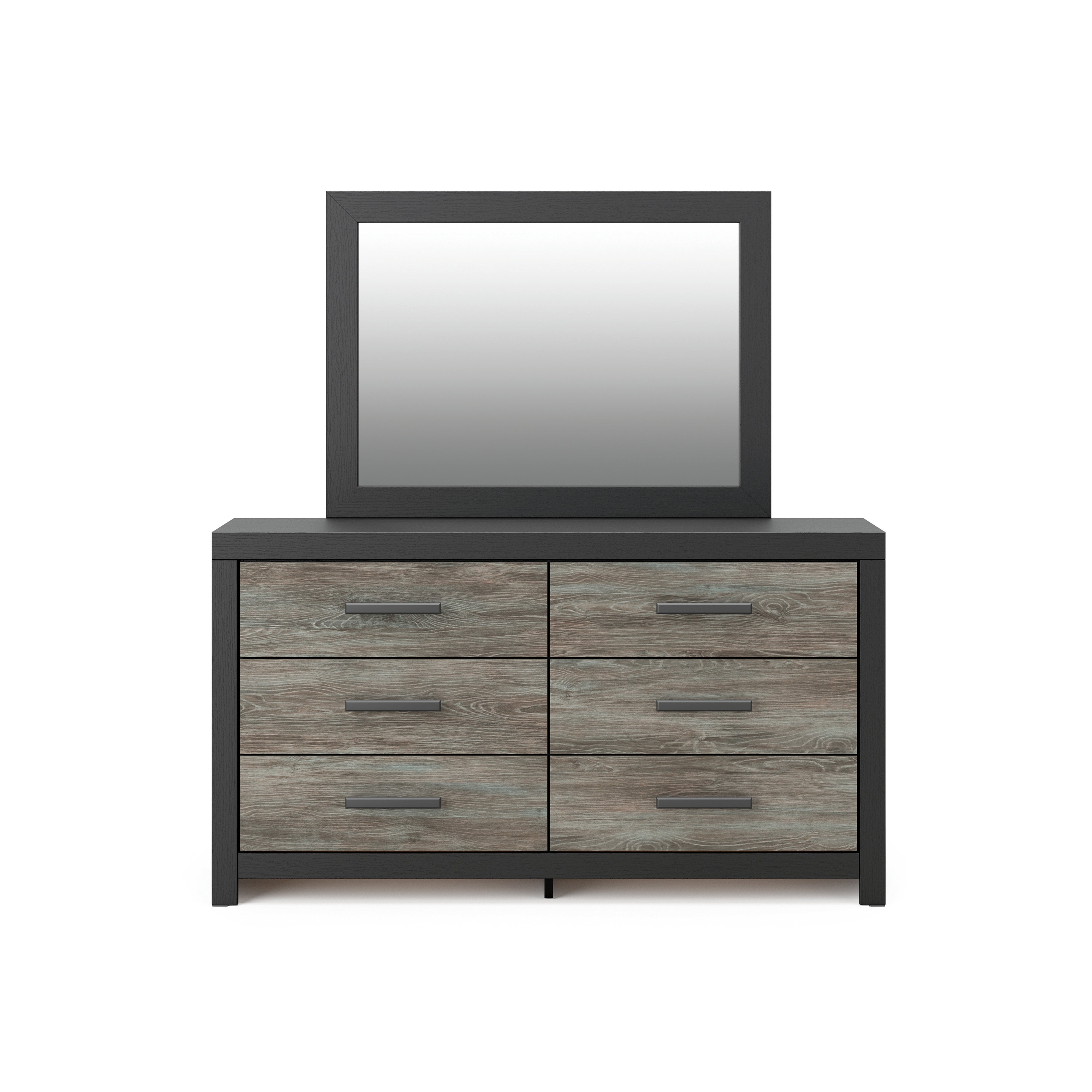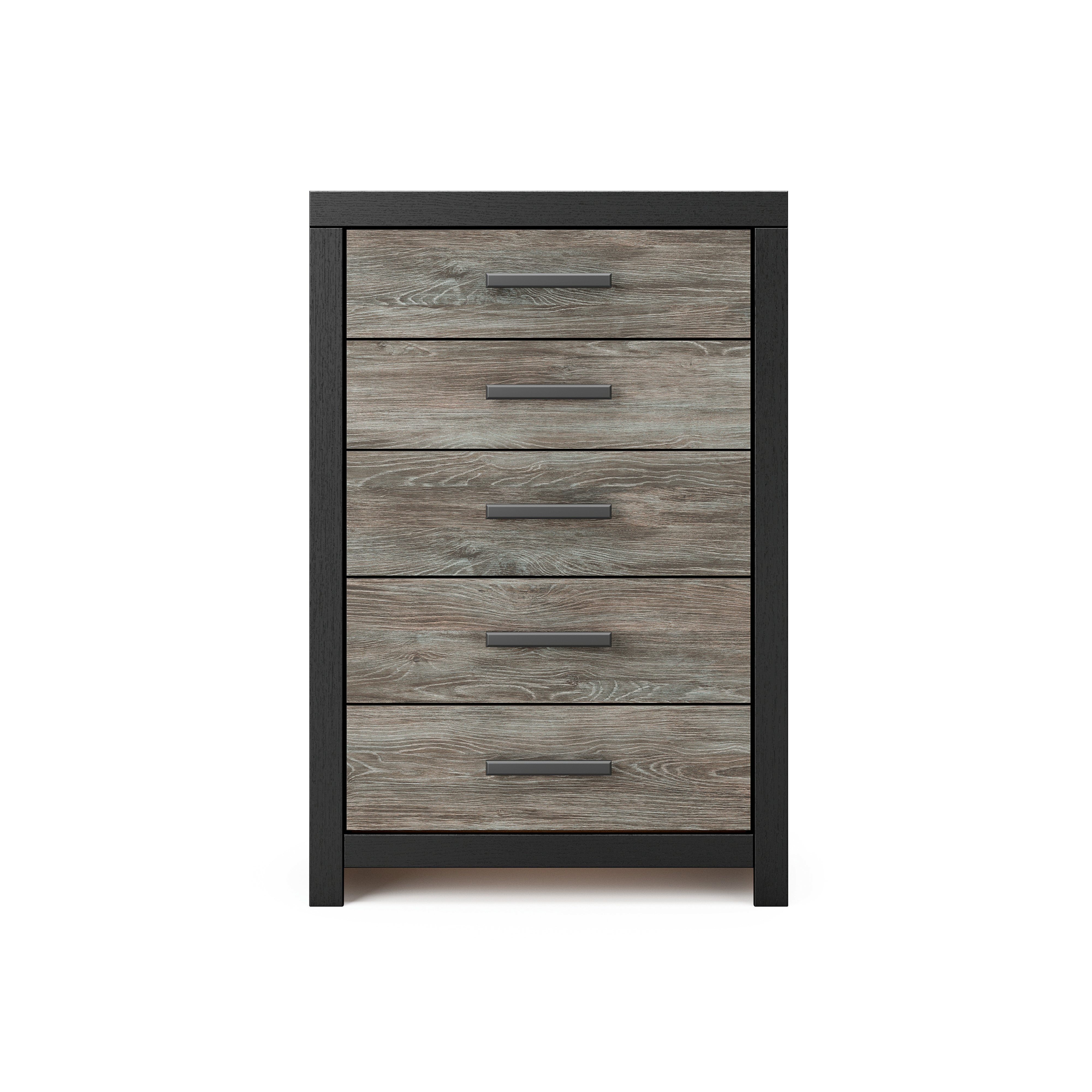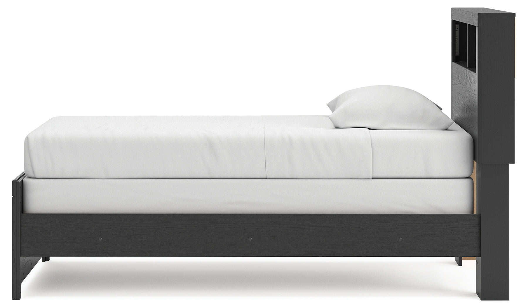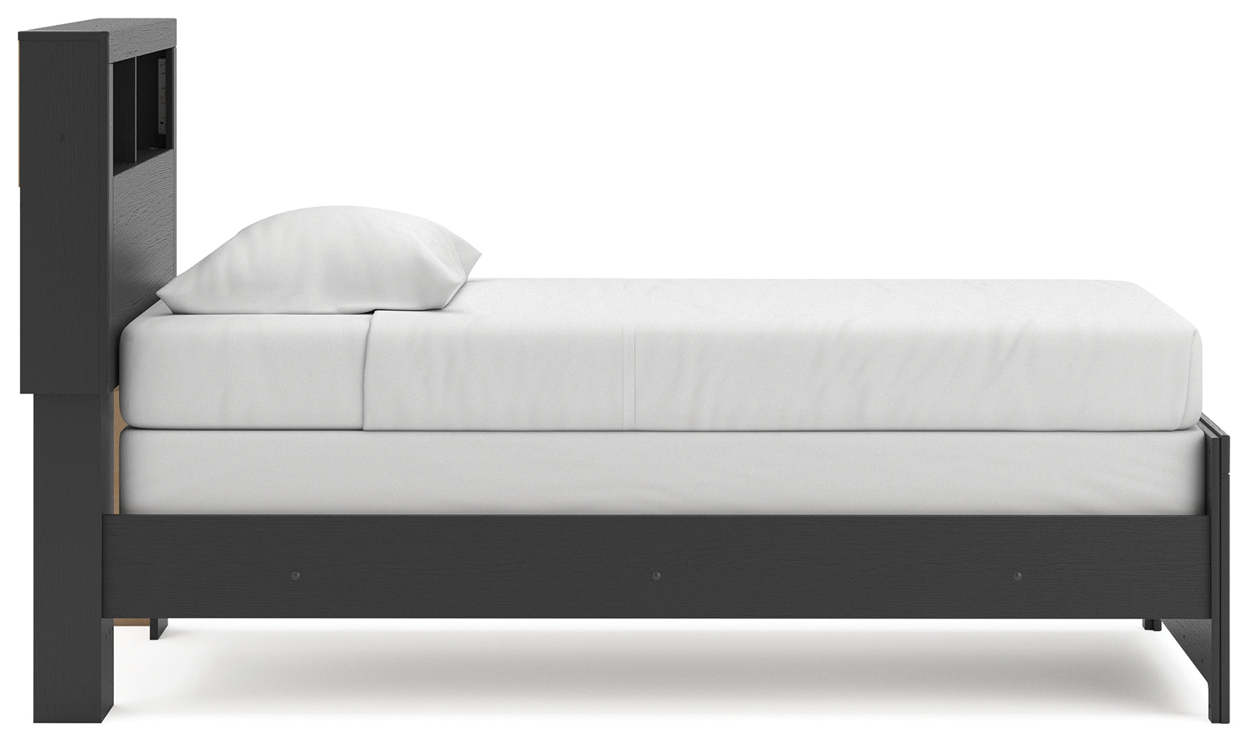Comfy and versatile, this stylish bookcase bed is available in Twin and Full sizes, bringing a calm, retreat-inspired feel to any bedroom. A modern two-tone finish pairs a warm rustic gray finish with a sleek matte black finish over replicated oak wood grain for balanced, neutral appeal. The functional bookcase headboard features three open storage cubbies, perfect for keeping books, toys, décor, and bedtime essentials within easy reach. Crafted from durable engineered wood with high-quality decorative laminate, this sturdy bed frame offers everyday strength and lasting style. Designed to require a foundation or box spring, it provides reliable comfort and support. Complete your space with the optional 5-piece bedroom set, including the Twin or Full Bookcase Bed, Dresser, Mirror, Nightstand, and Chest, delivering coordinated bedroom furniture, smart storage solutions, and a cohesive modern look.