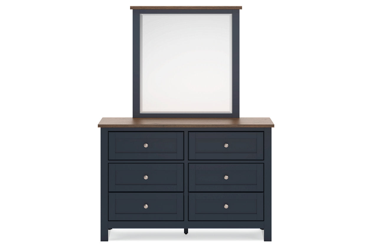 The Landocken Youth Bedroom Set by Signature Design by Ashley brings a blend of modern style and classic charm to any bedroom. This set features a striking two-tone finish with a dark slate blue and light brown wood-tone top, creating a warm and inviting atmosphere. The Shaker-style drawer fronts and legs add a touch of timeless simplicity, making it a versatile choice for both kids' rooms and guest suites. Crafted with hardwood solids, mindi wood veneer, and MDF substrates, this bedroom set is designed for durability and long-lasting appeal. Its elegant design is complemented by nickel-tone metal knobs, adding a subtle touch of sophistication to the overall look.
