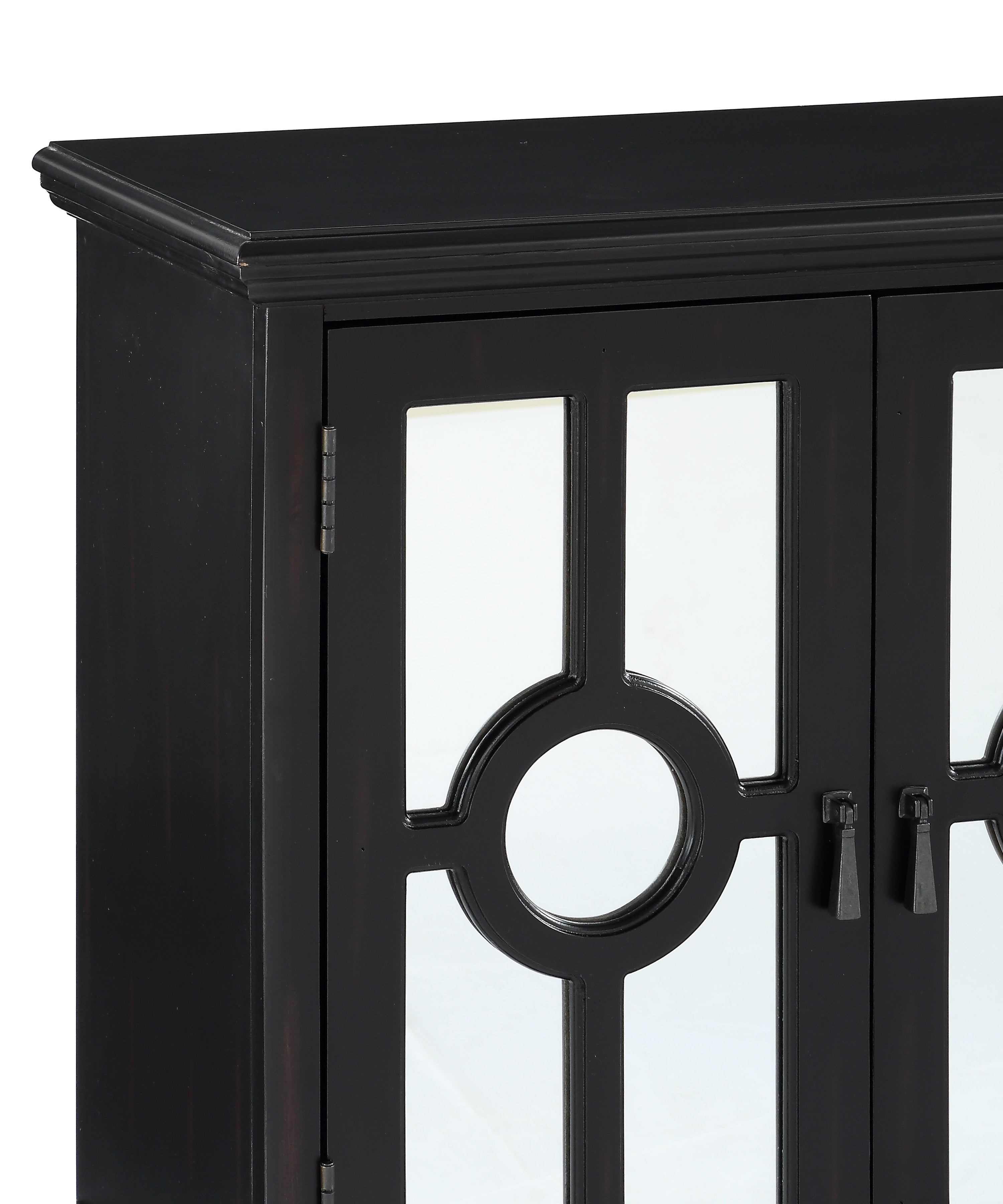 The Poppy Collection provides classic accent to your home’s décor while meeting your storage needs. The modern traditional design of the cabinet features behind door shelving, turned support feet, black finish, circular themed decorative mixed-media glass and wood doors, and antiqued brass hardware. Also available in aqua and gray finish.