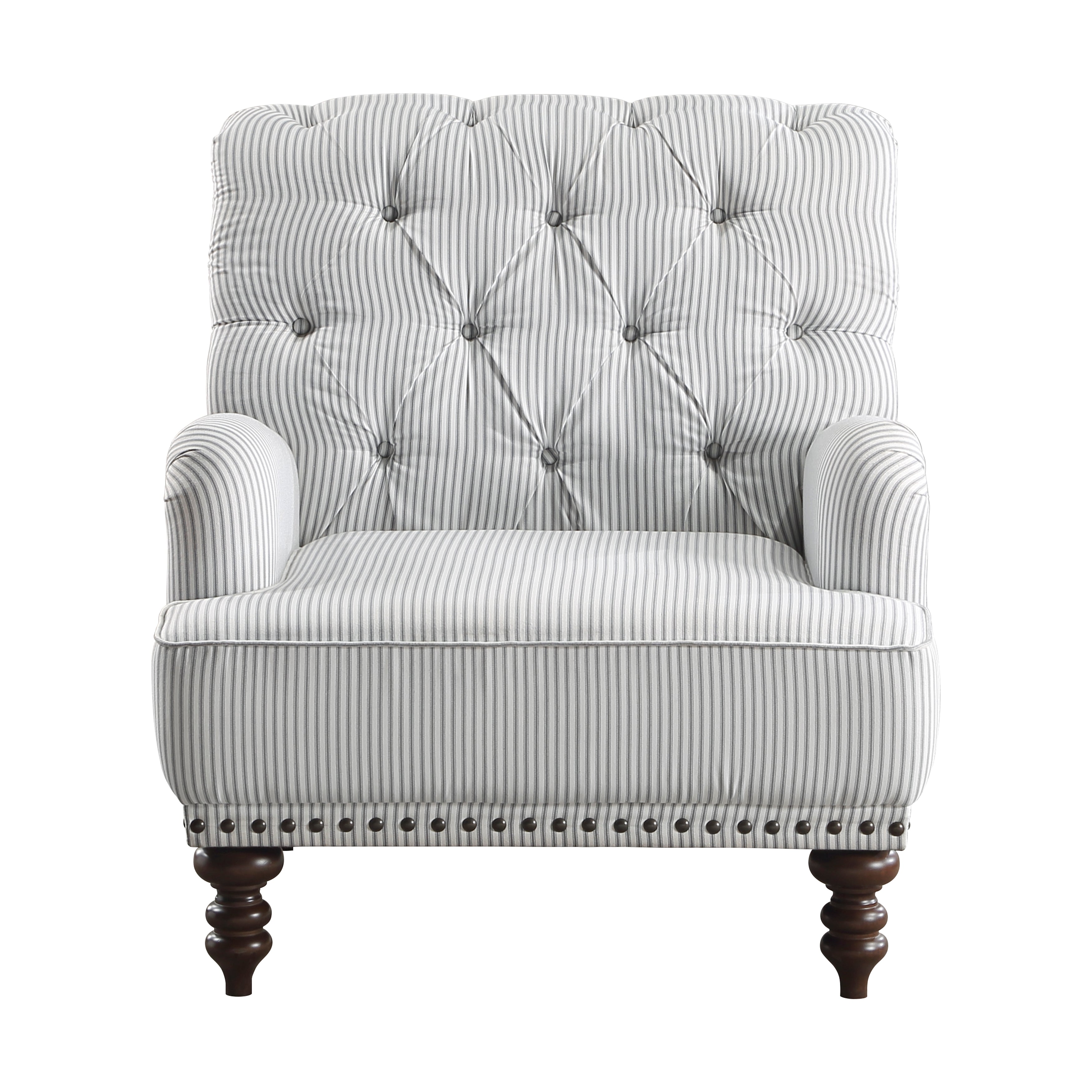 An air of refined tradition lends its elegance to the design of the Holland Park Collection. Tailored to enhance the graceful curves of the chair’s profile, classic accenting in the form of turned legs and button tufting further the timeless look of the piece. Gray and white striped fabric upholstery covers the chair, its neutral hue a perfect complement to your space.